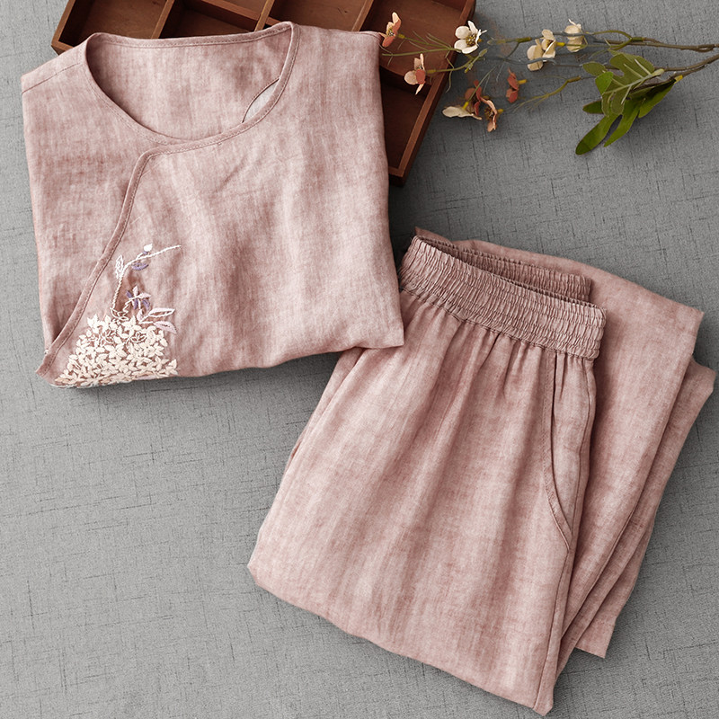 夏季新中式斜襟系带刺绣上衣阔腿裤套装女休闲大码麻料垂感两件套