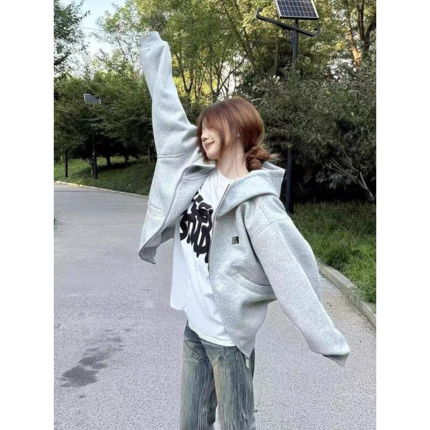 大码胖mm美式高街灰色高领连帽卫衣女秋冬加绒宽松慵懒风开衫外套