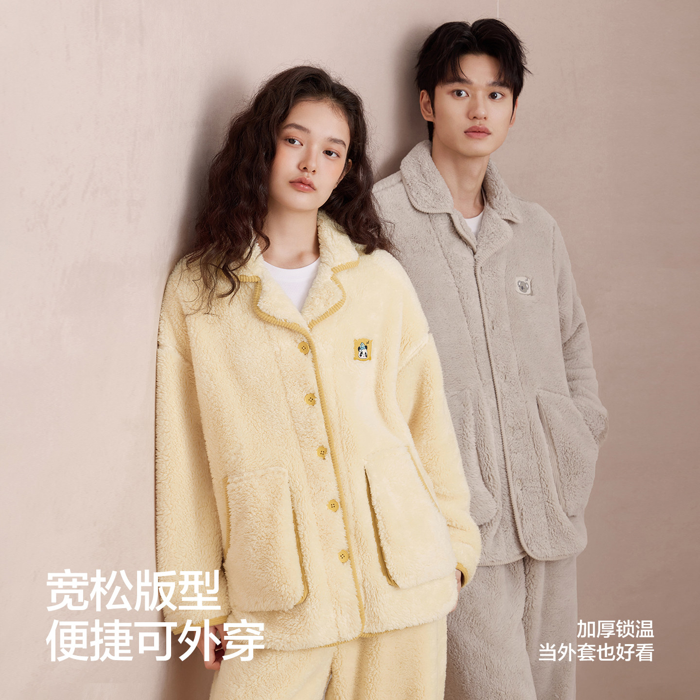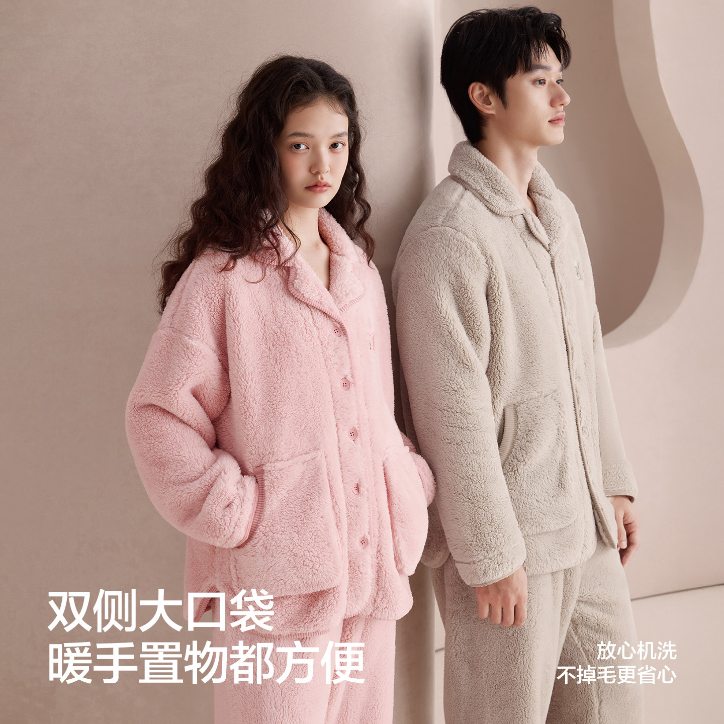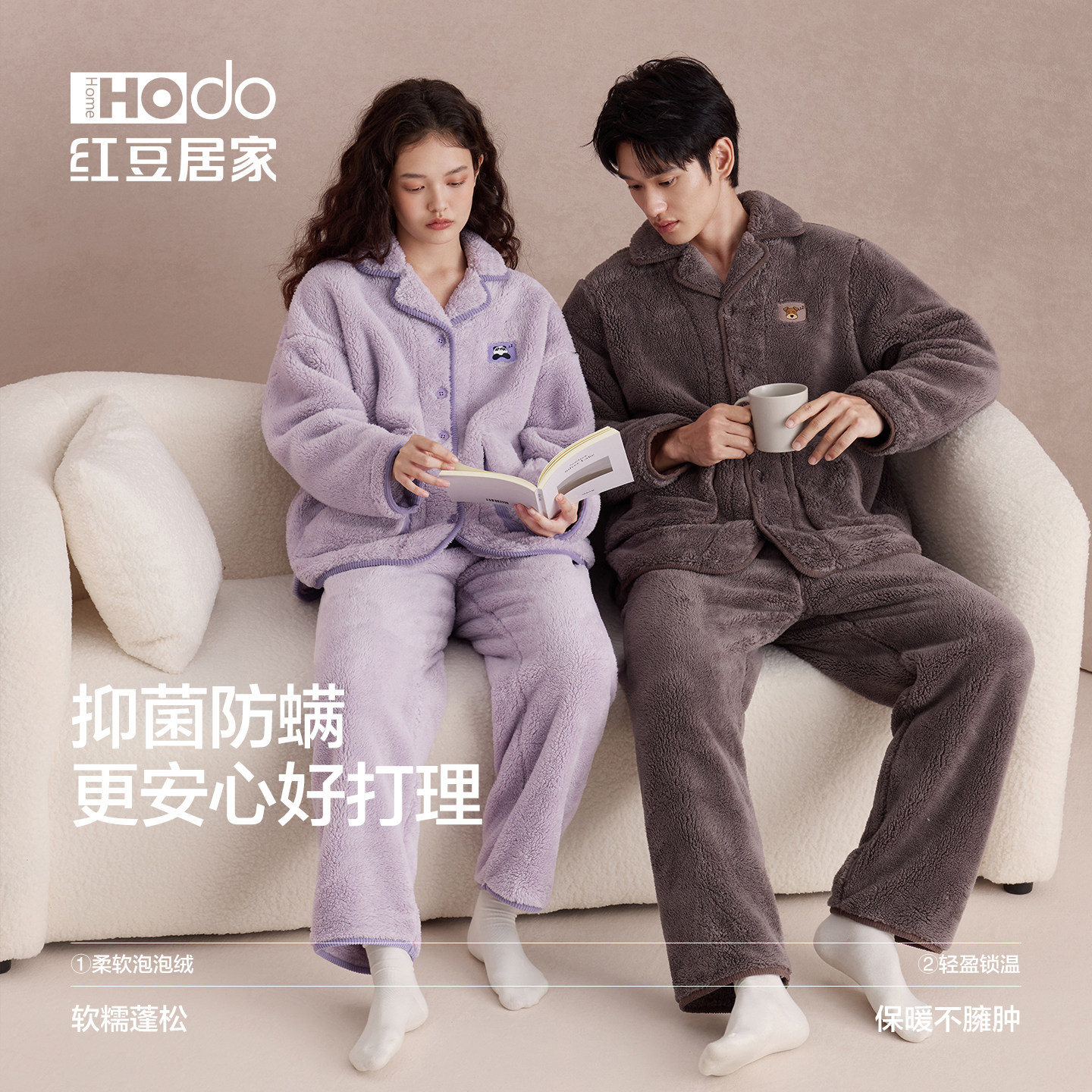 红豆珊瑚绒睡衣冬季情侣抗菌防静电男女士加绒加厚保暖家居服套装