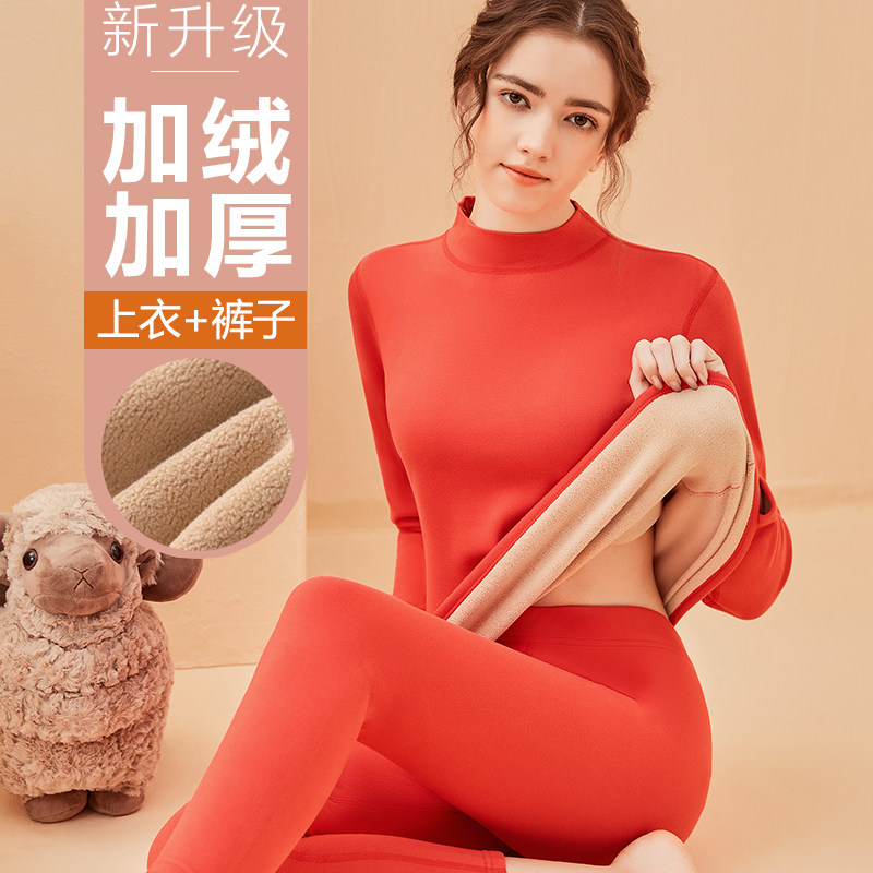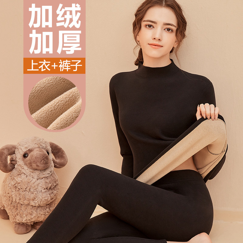 中高领保暖内衣女加绒加厚一体羊羔绒中老年秋衣秋裤套装德绒发热