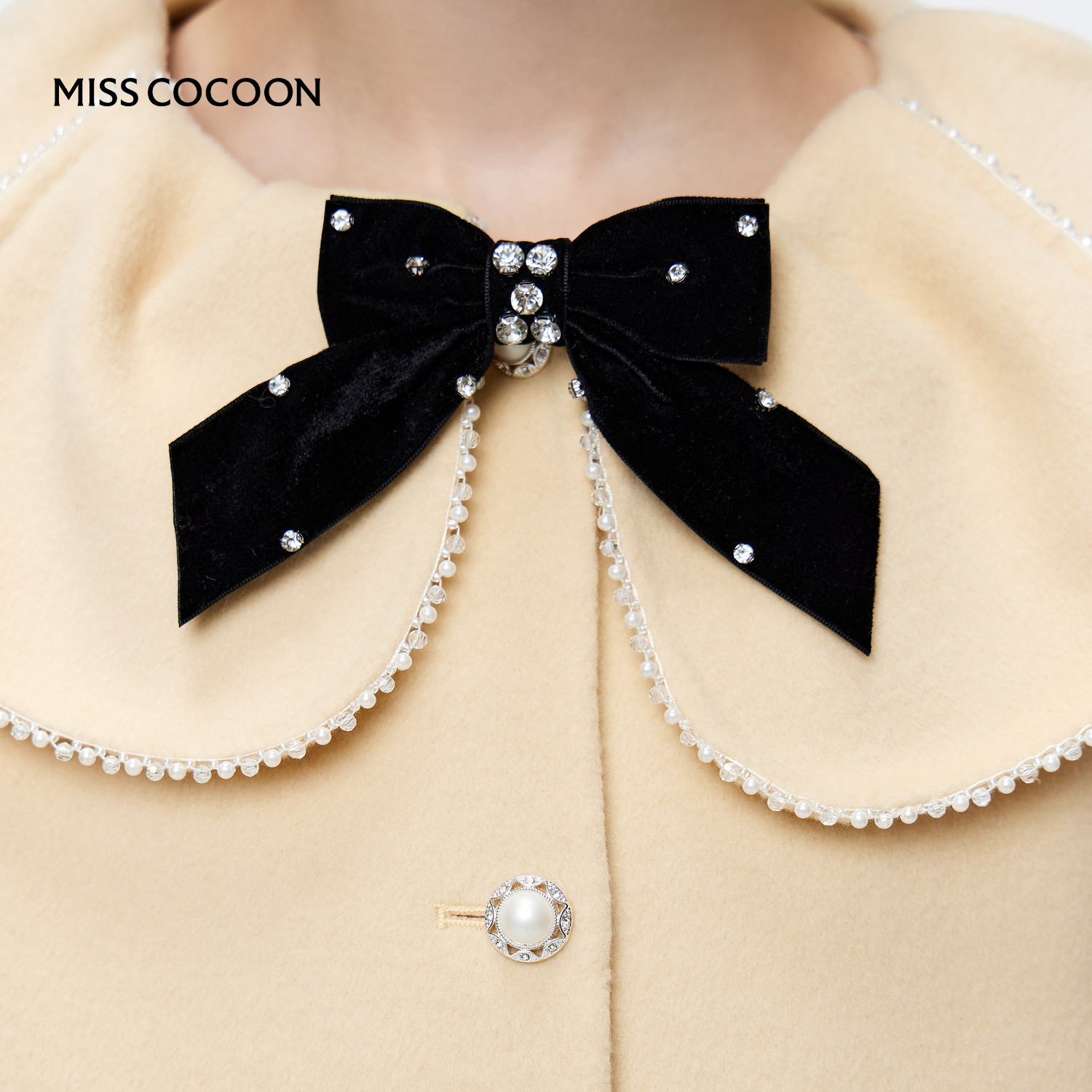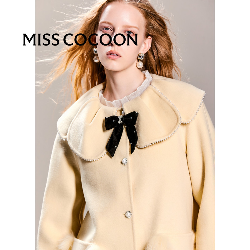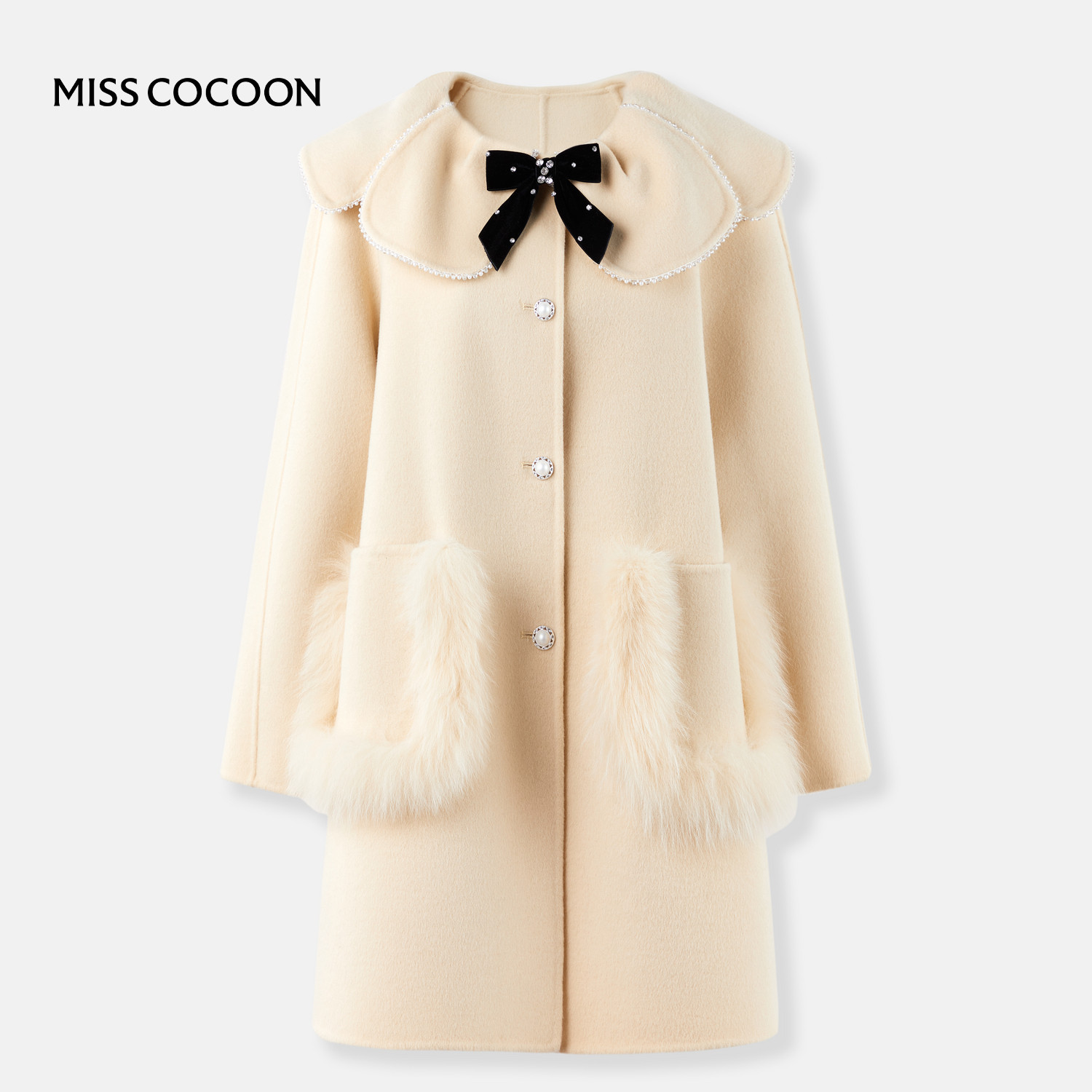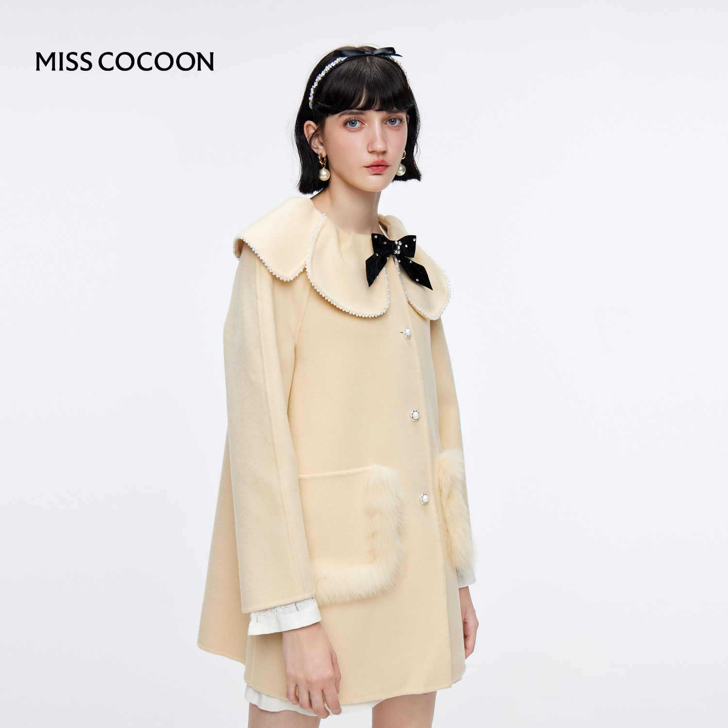 MISSCOCOON学院风花瓣领绵羊毛大衣狐狸毛口袋可拆蝴蝶结秋冬款