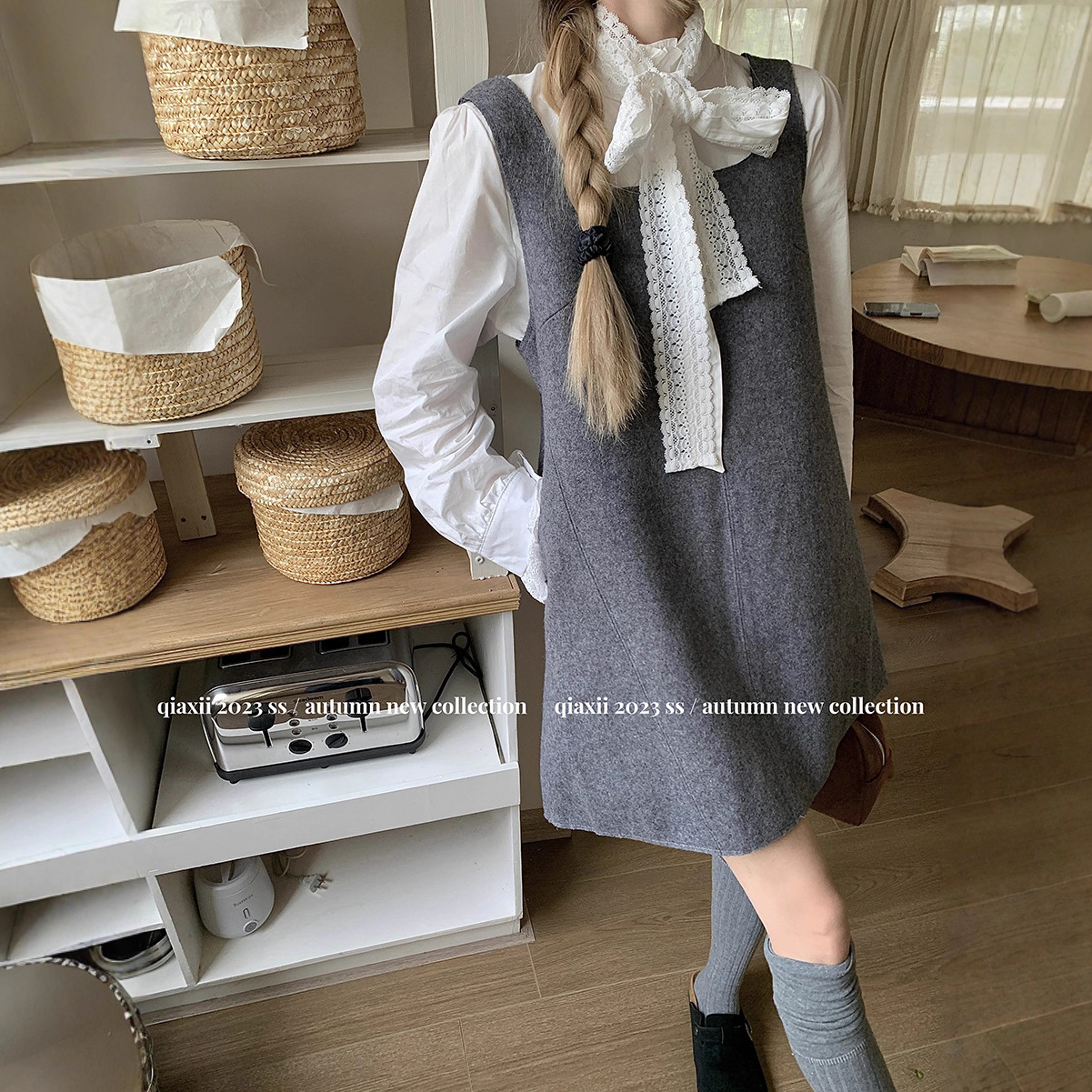 法式蝴蝶结系带长袖衬衫毛呢背心连衣裙女2025秋季新款时尚套装