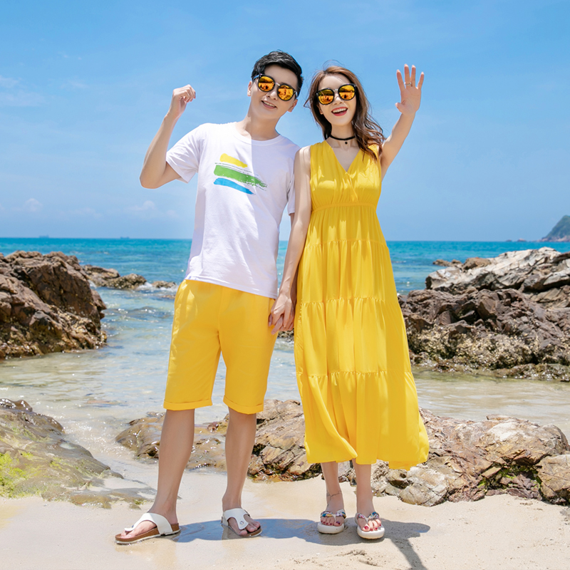 亲子装夏装2020新款一家三口海边度假沙滩裙母女装黄色V领连衣裙