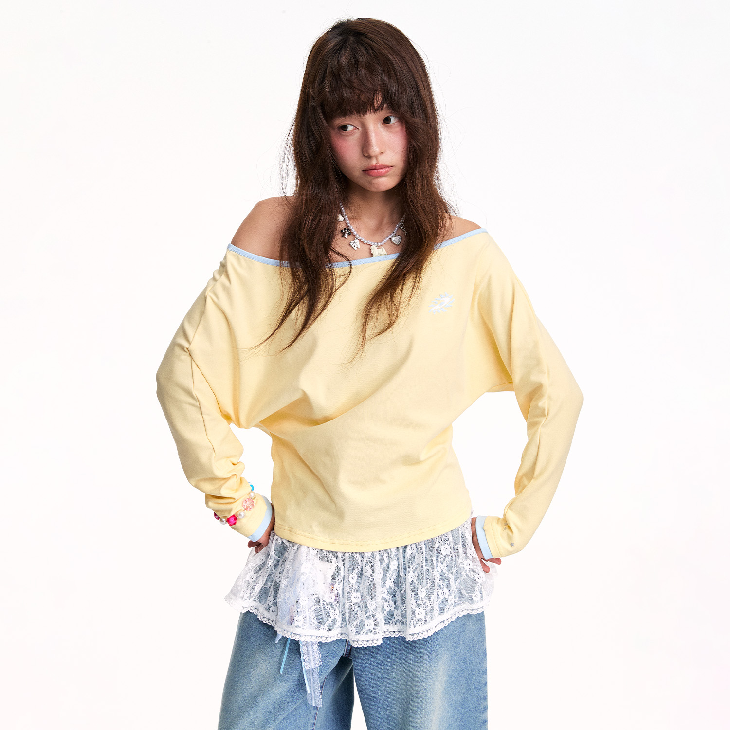 江南先生NewJNXS弹力针织撞色logo绣花斜肩下摆拼接假两件长袖T恤