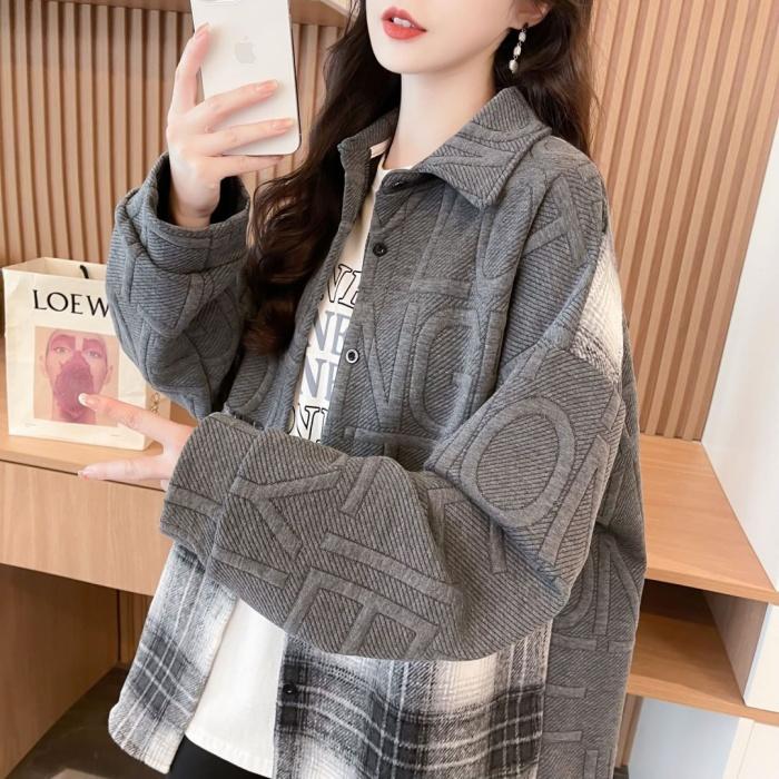 爆款大码宽松时尚格子拼接撞色衬衫外套女春秋百搭洋气薄款潮上衣