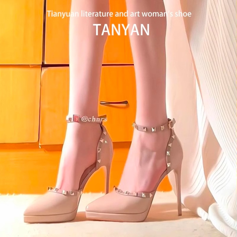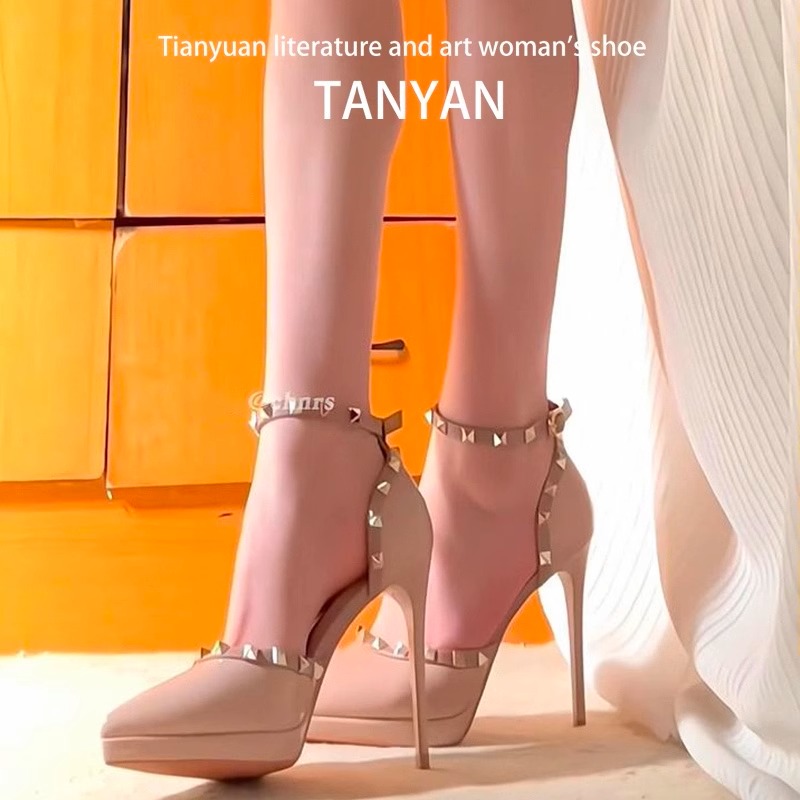 裸色防水台一字带高跟鞋不累脚2025年新款夏季铆钉细跟包头凉鞋女