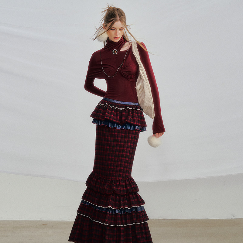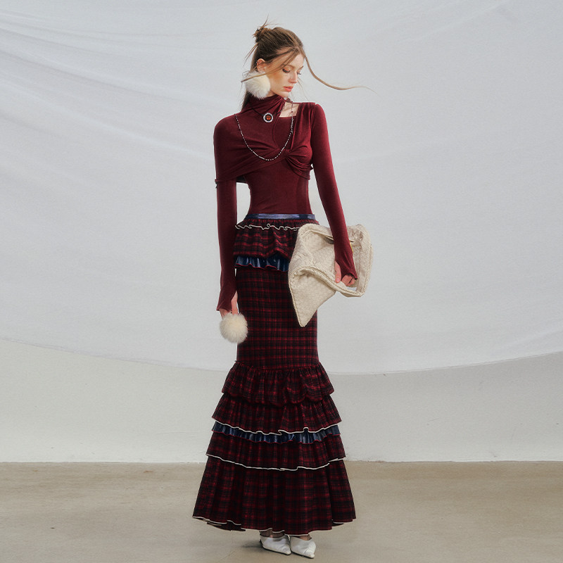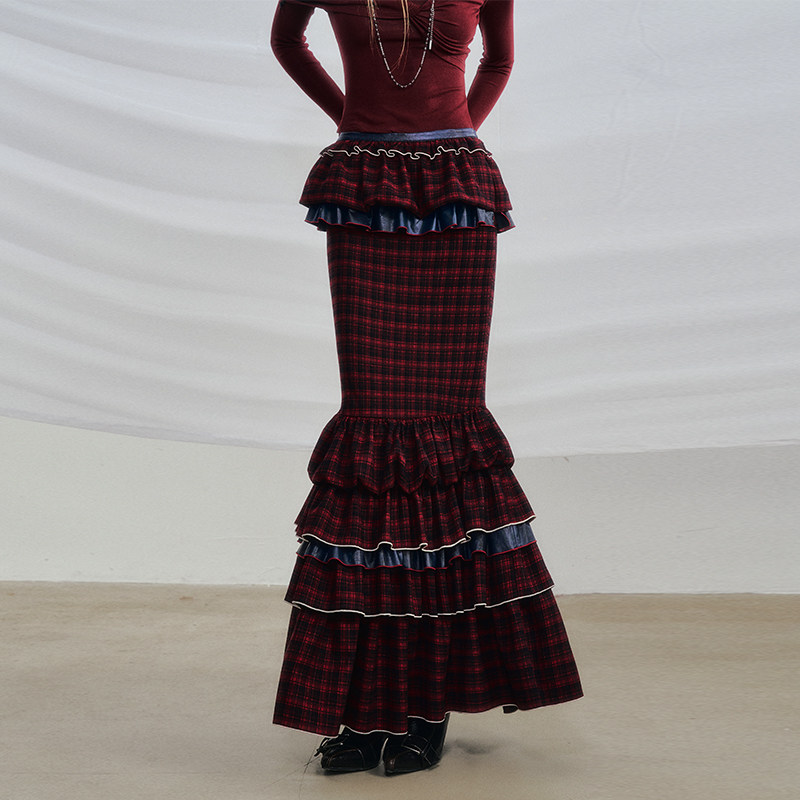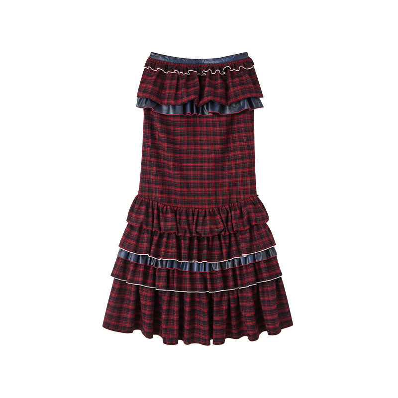 【现货】OfAkiva“红丝绒”圣诞红色格纹撞蓝长短两穿鱼尾蛋糕裙