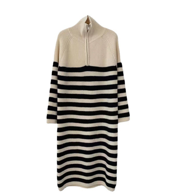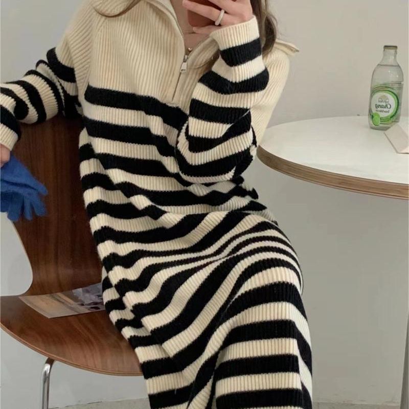 条纹翻领针织连衣裙女套头拉链设计感长袖过膝打底裙中长款毛衣裙
