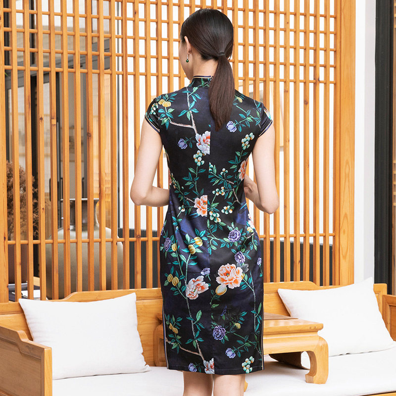木真了复古日常旗袍裙新品桑蚕丝花鸟印花修身连衣裙半袖909