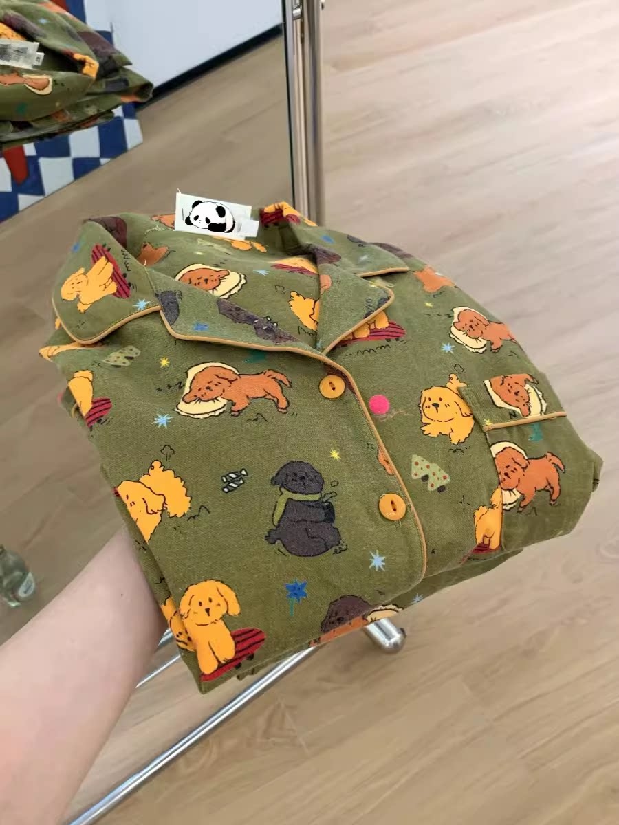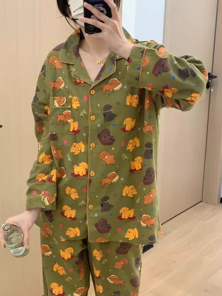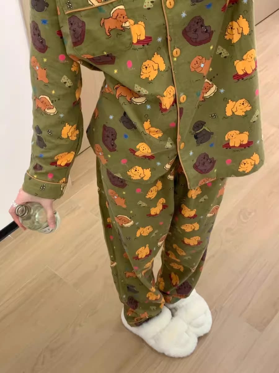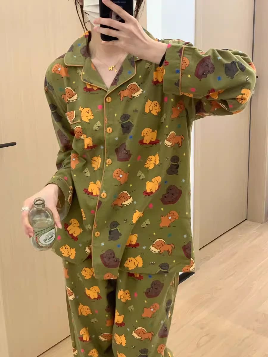 显白橄榄绿可爱小狗印花长袖睡衣女春秋款网红休闲家居服大码套装