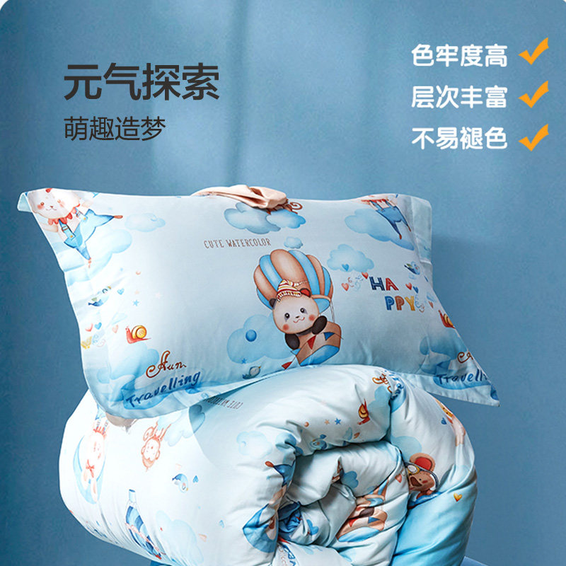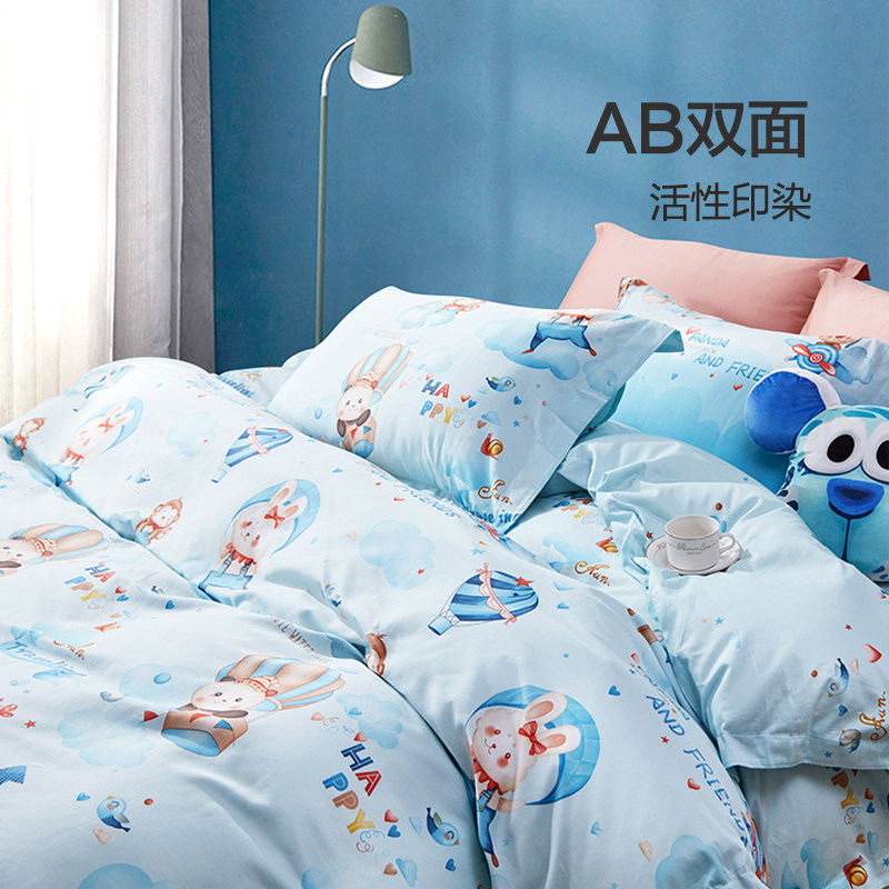 富安娜60支长绒棉儿童四件套卡通床品三套件蓝色男童印花被套床单