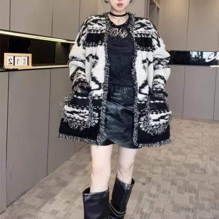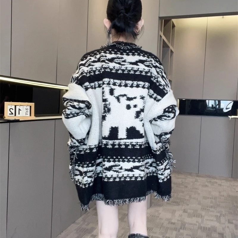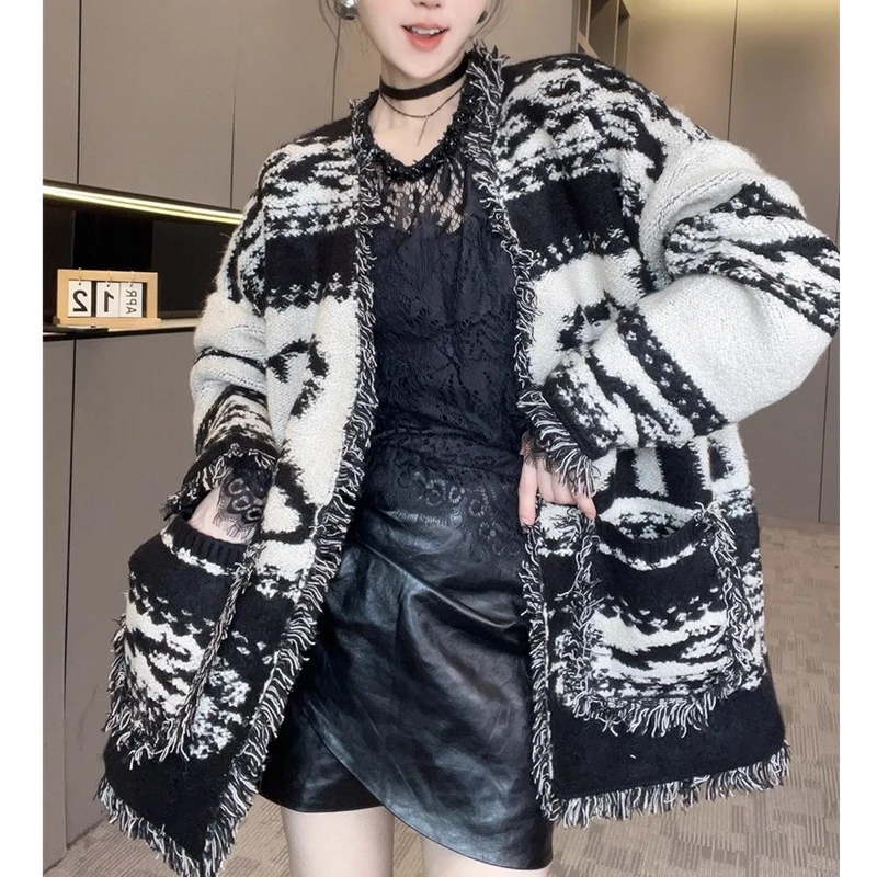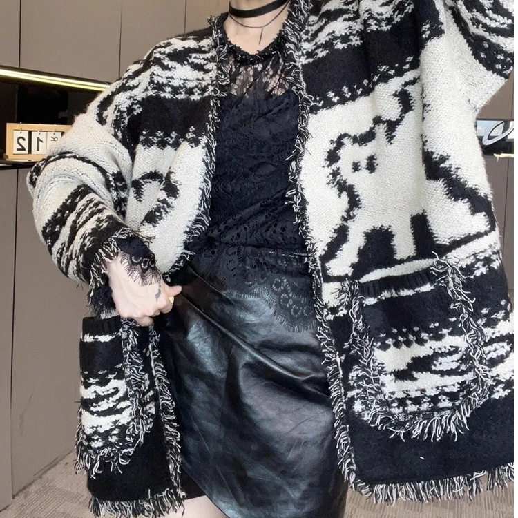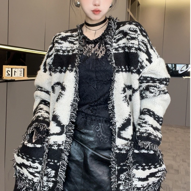 2025秋季新款法式气质毛边针织开衫毛衣女装中长款松弛感宽松外套