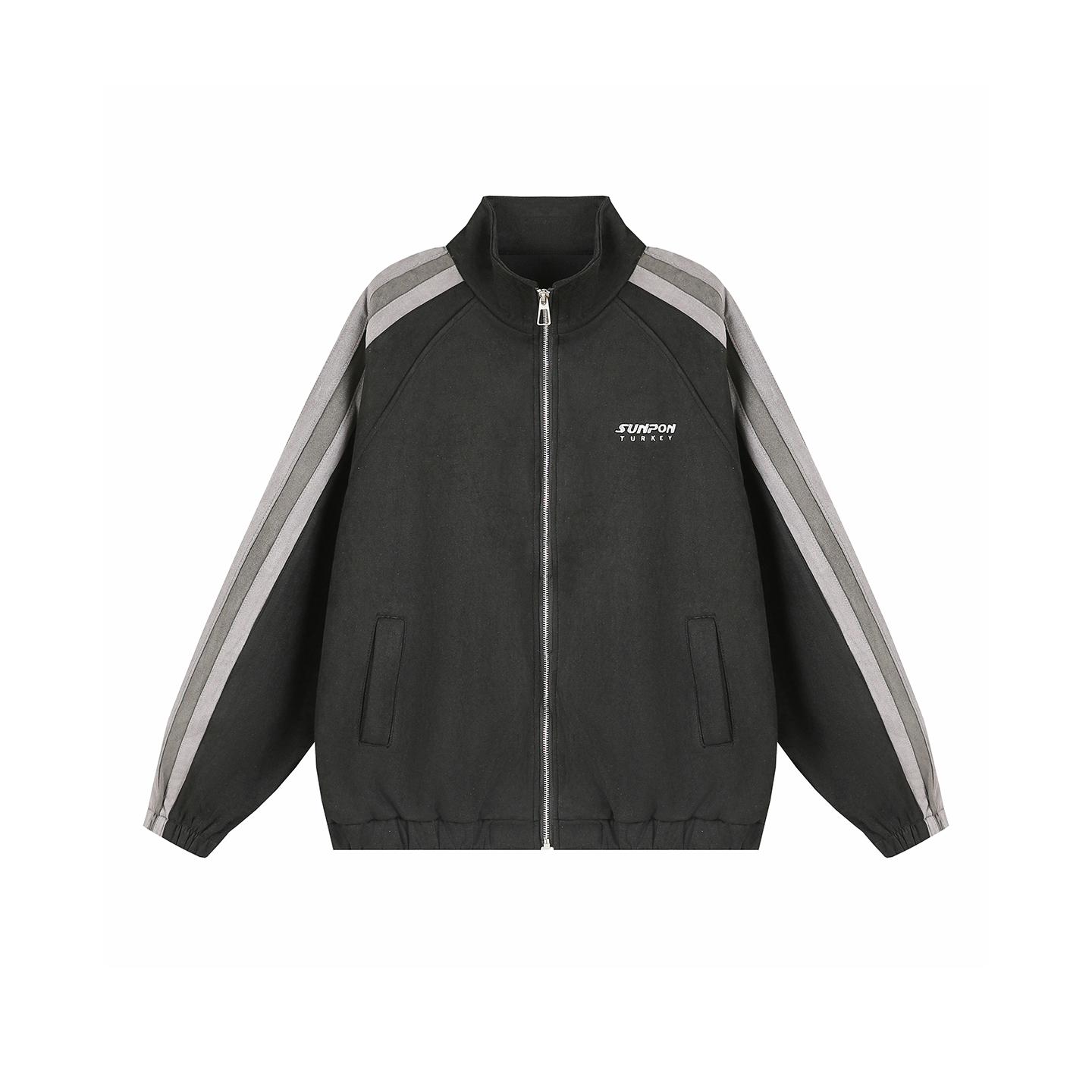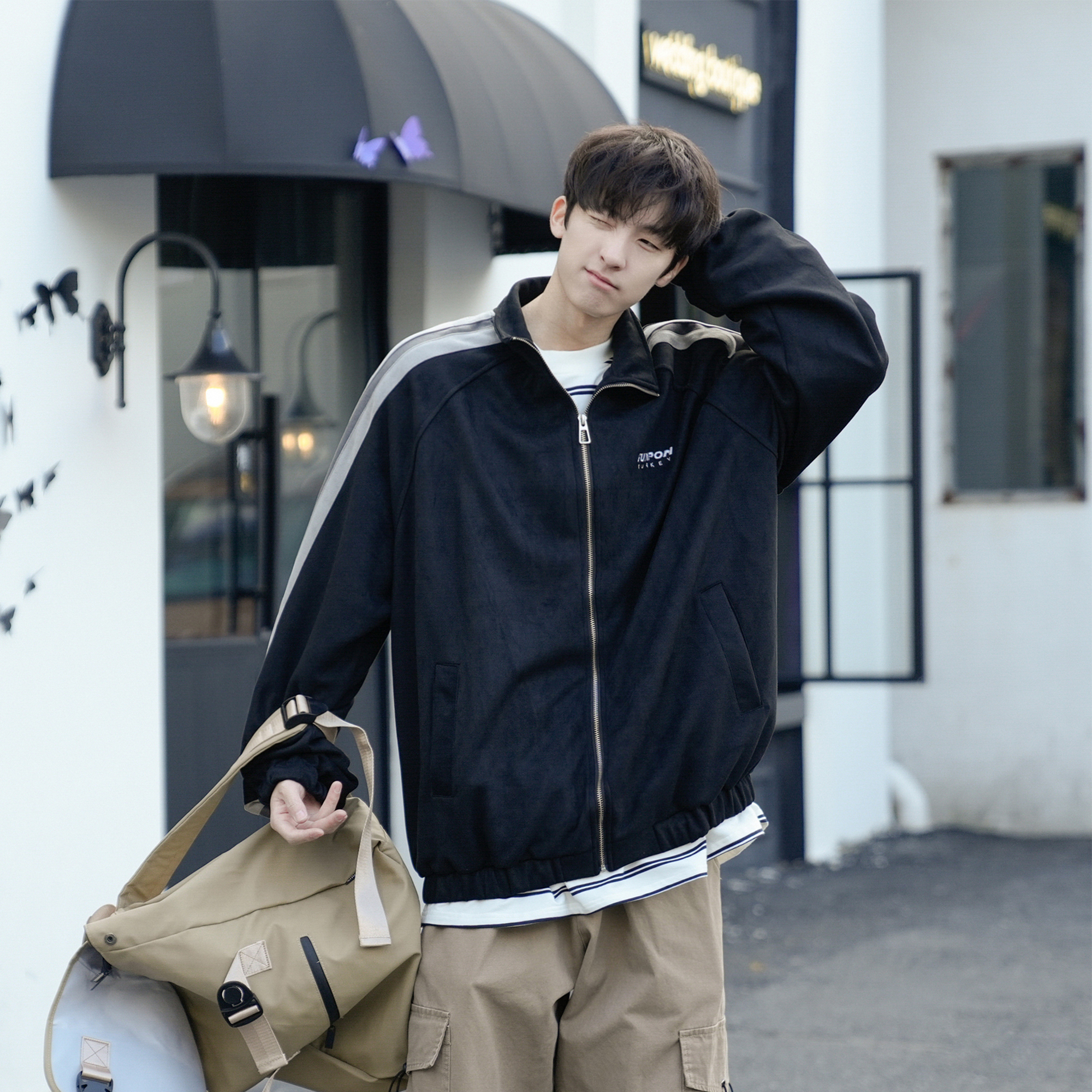 @港仔文艺男 美式麂皮绒立领外套男春秋宽松拼接条纹男生运动夹克