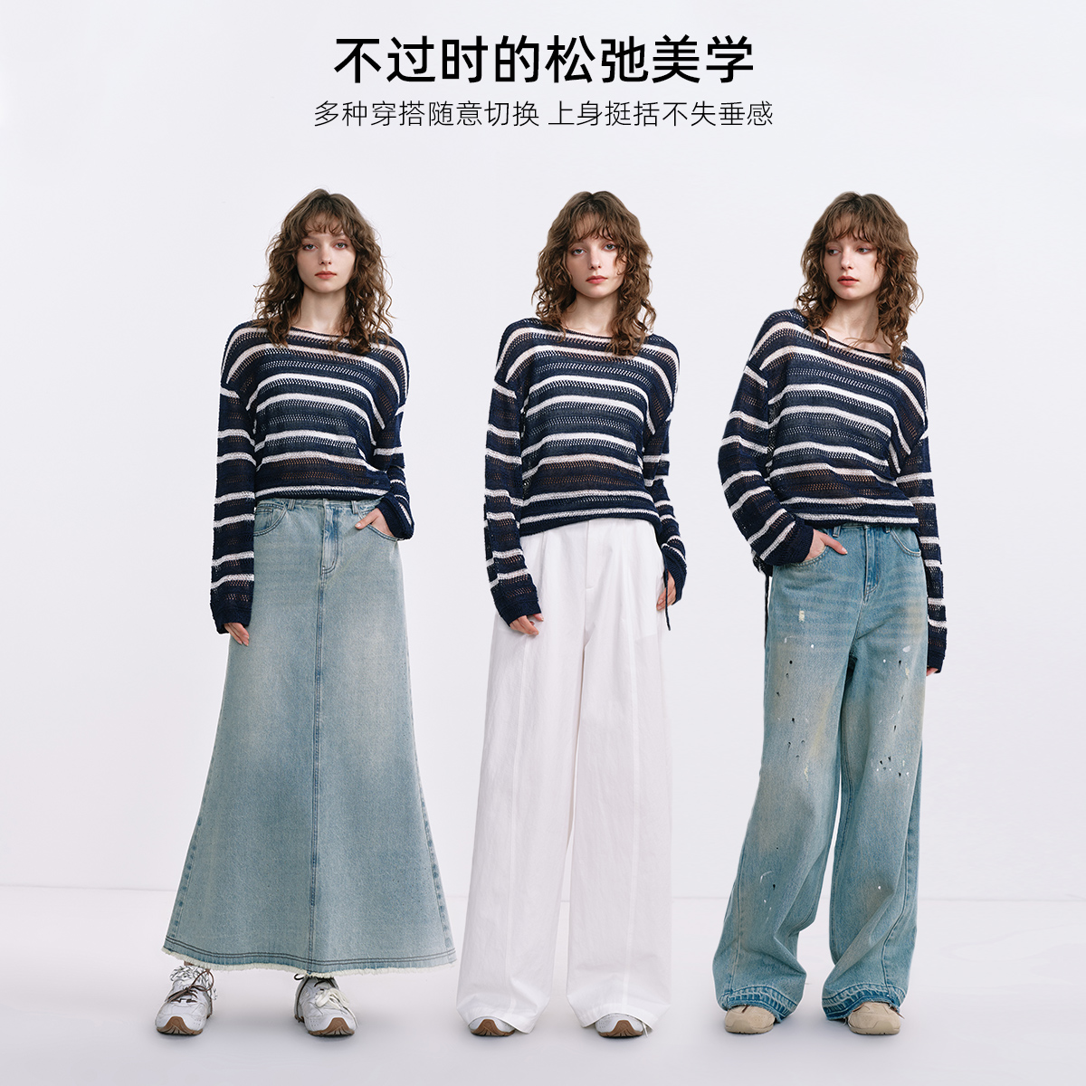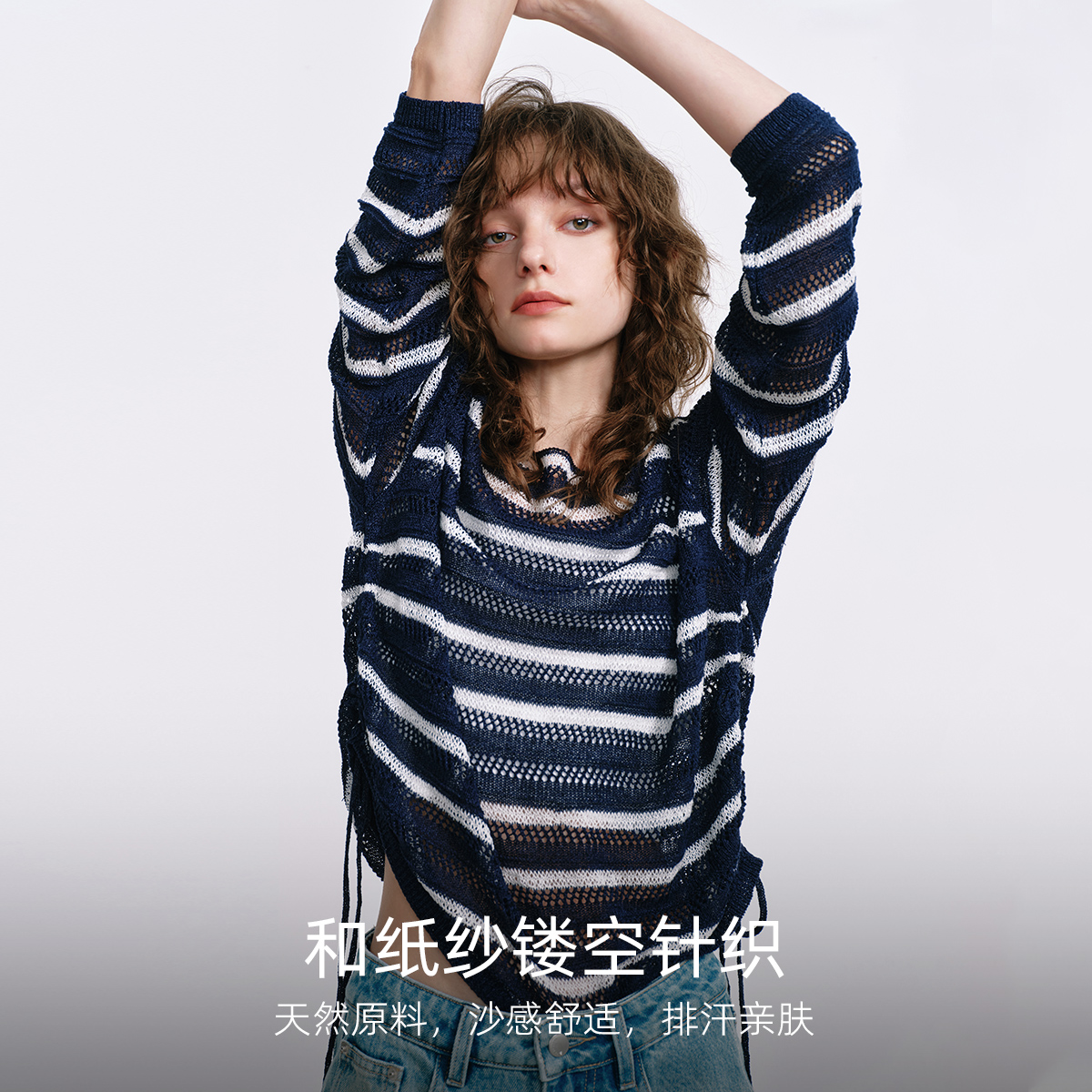 KBNE和纸纱镂空条纹莱赛尔针织衫女25秋季新款气质蓝色长袖上衣