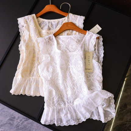 刺绣绣花压褶荷叶边宽松显瘦圆领减龄甜美无袖背心女衬衫衬衣X884