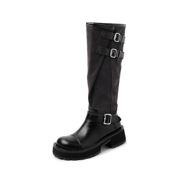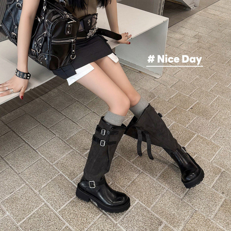 2025新款真皮厚底长筒靴子甜酷辣妹风宽松皮带扣圆头高跟西部靴女