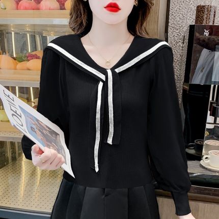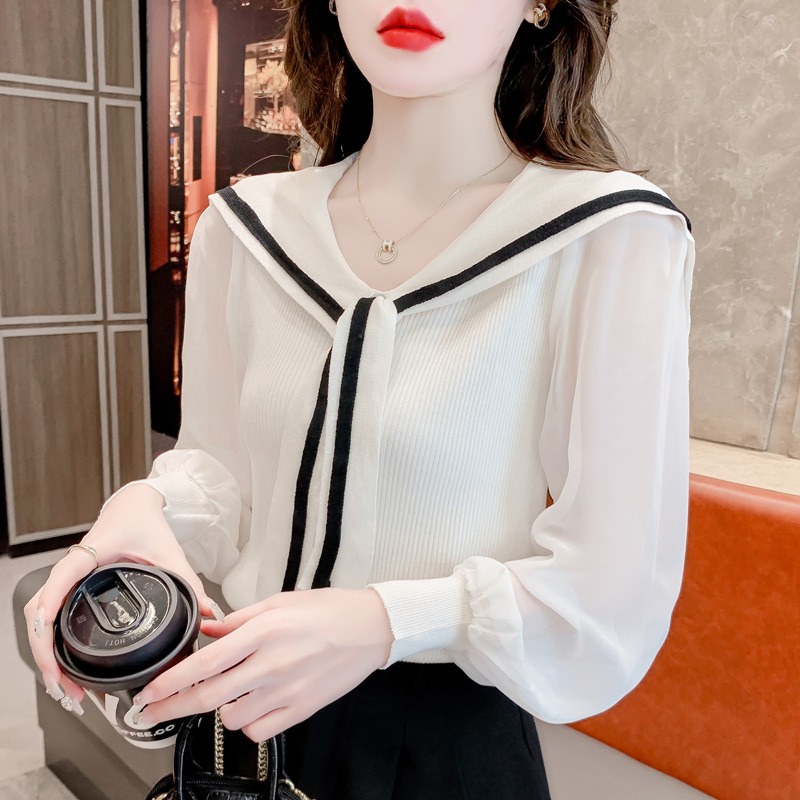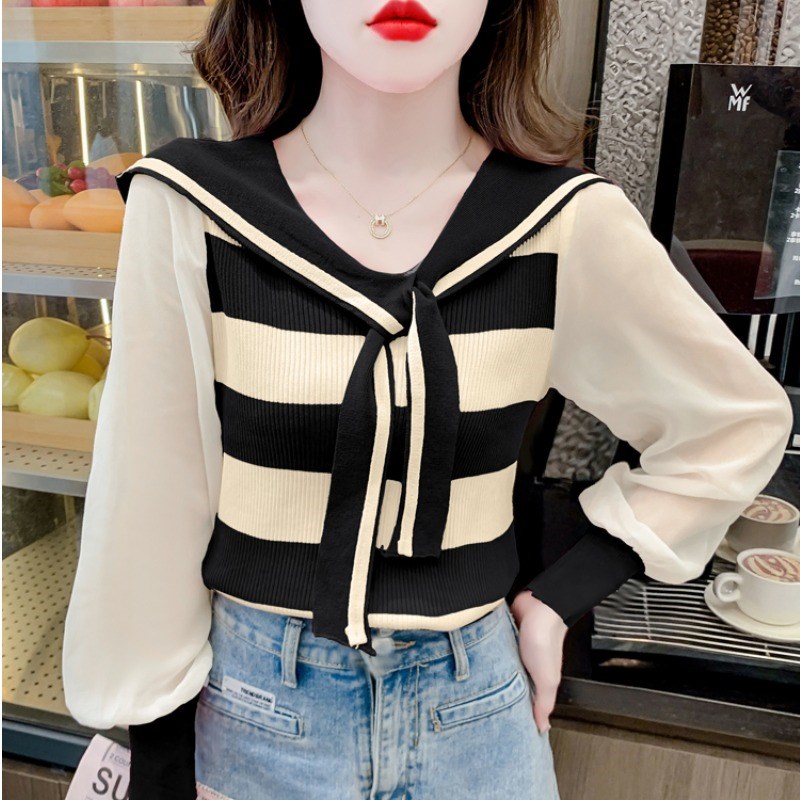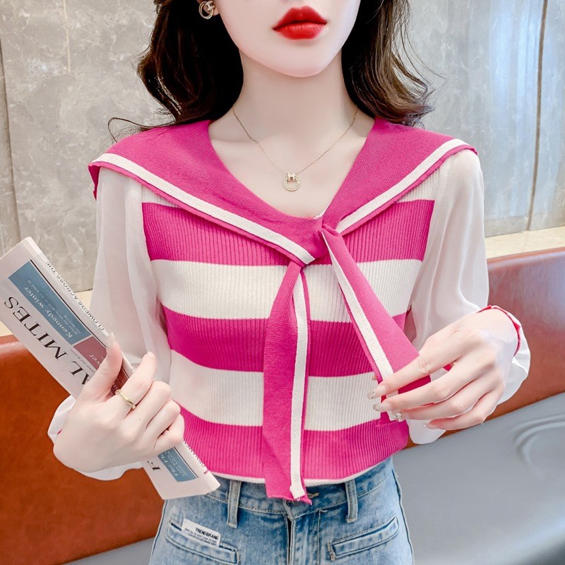 时尚洋气海军领系带披肩针织衫女春装新款拼接雪纺长袖别致上衣潮