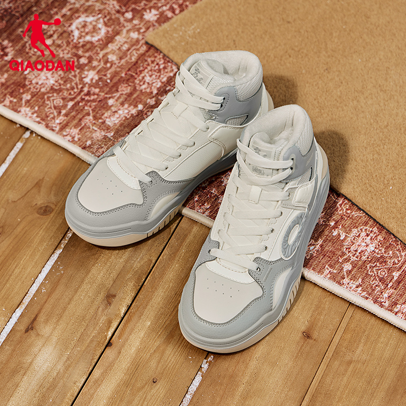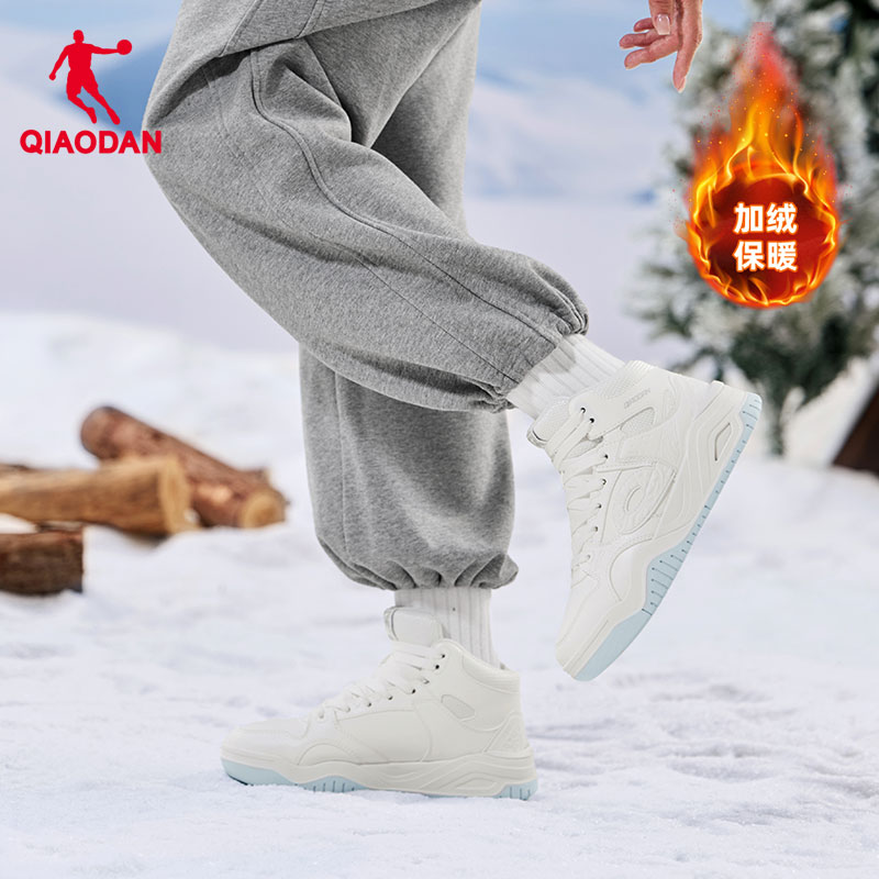 乔丹女款白色运动加绒棉鞋皮面保暖板鞋女启承高帮冬季新款休闲鞋