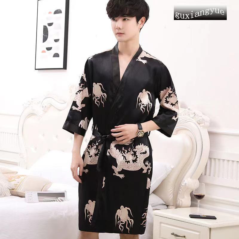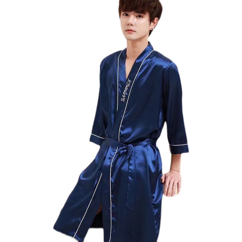 男士薄款夏季简约冰丝中长款家居服睡袍一体式七分袖丝绸浴袍睡衣