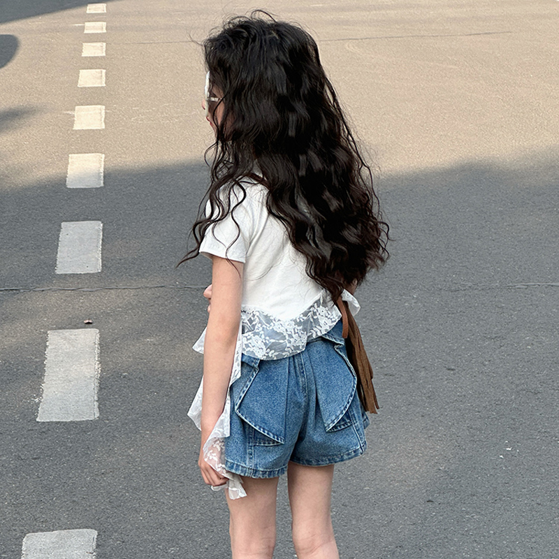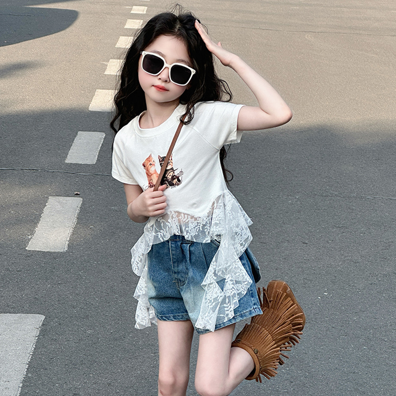 女童短袖夏装T恤2025新款儿童洋气时髦蕾丝拼接上衣中小童打底衫