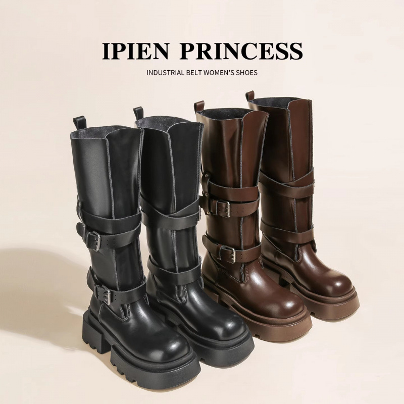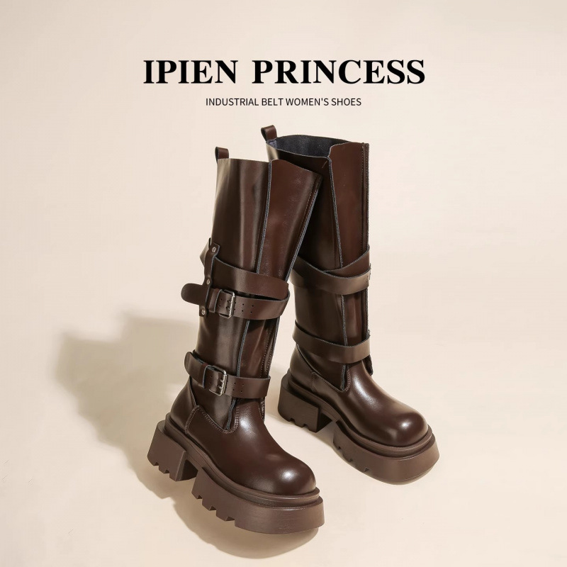 棕色厚底长筒靴女2025秋季新款英伦风皮带扣机车靴粗跟高筒瘦瘦靴