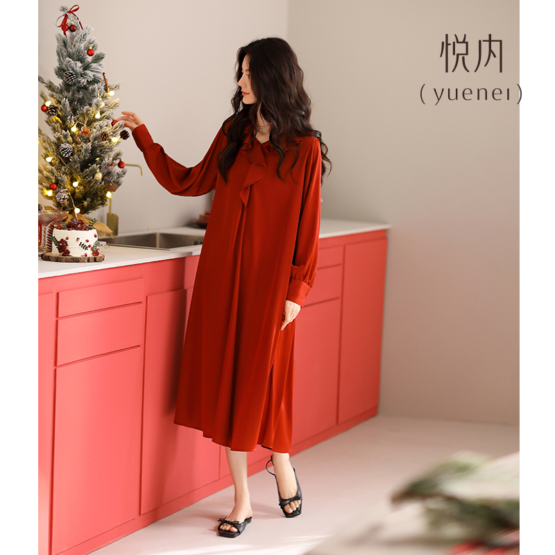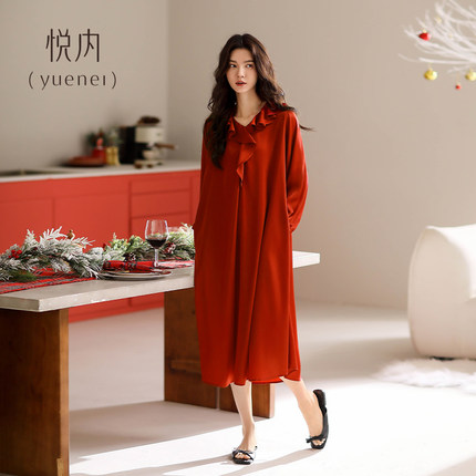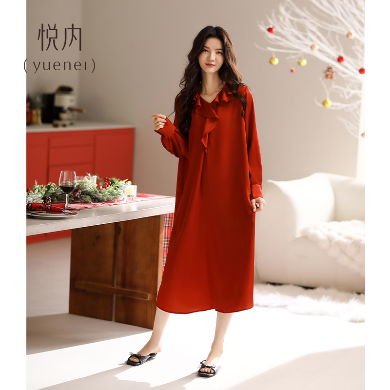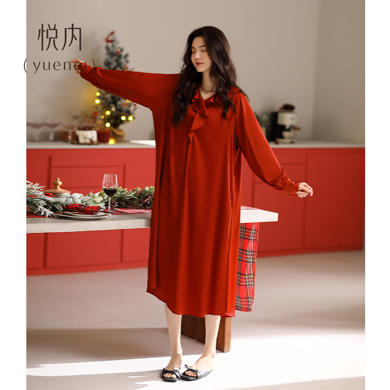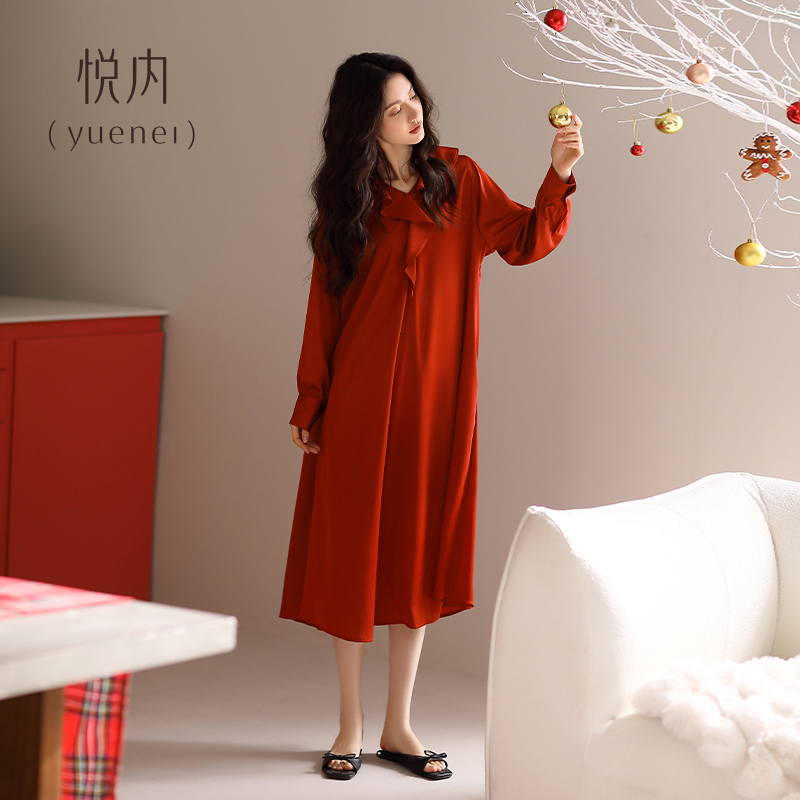 悦内大红色睡裙女士睡衣春秋款秋季长袖冰丝绸大码本命年蛇年新年