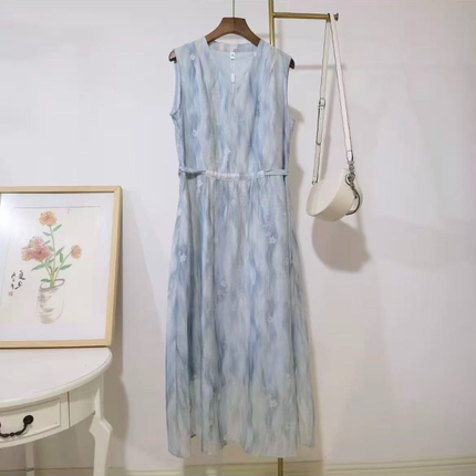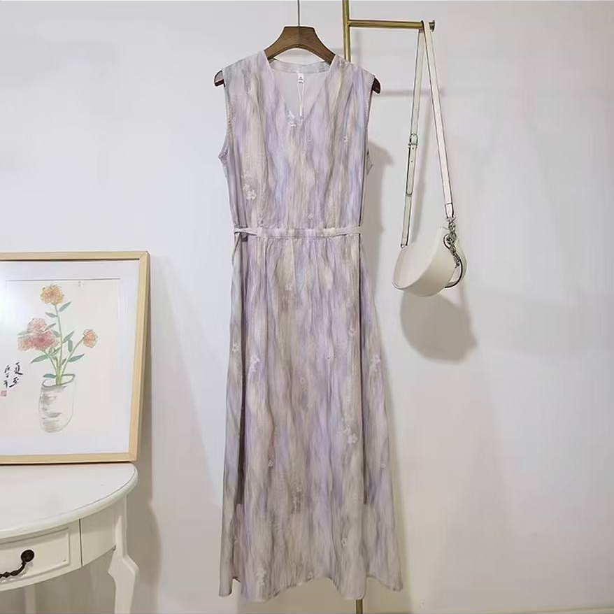 0837 夏季新款优雅气质V领收腰中长款无袖连衣裙LY