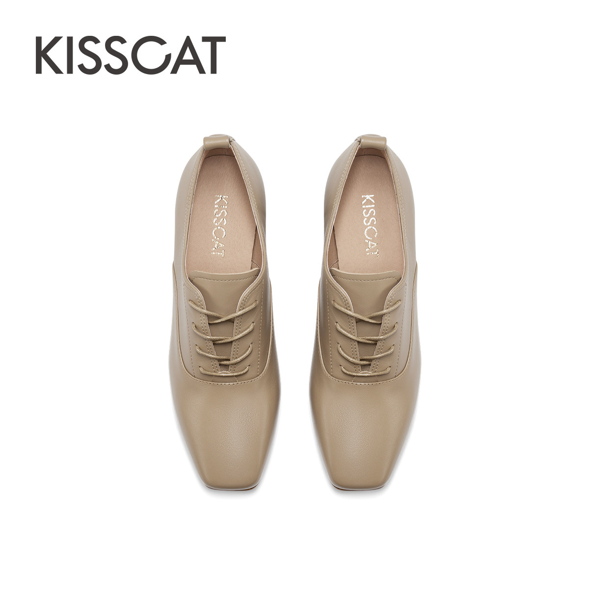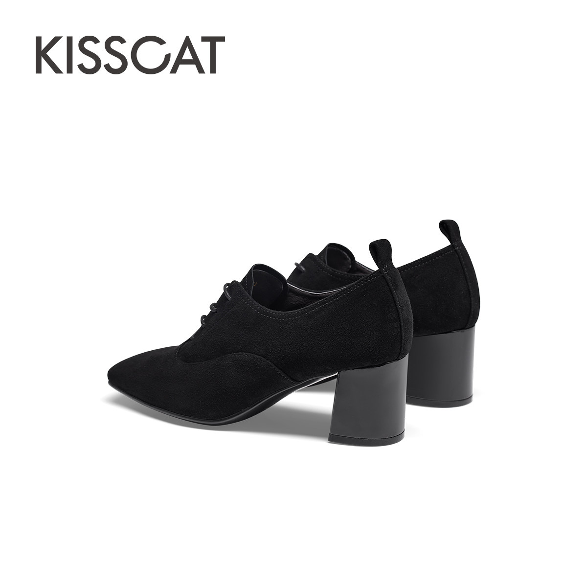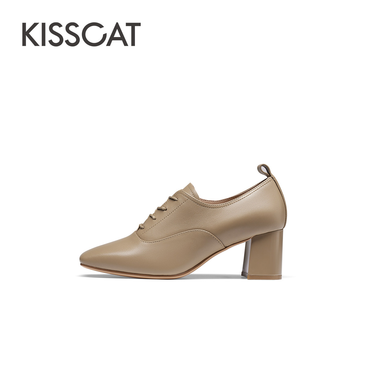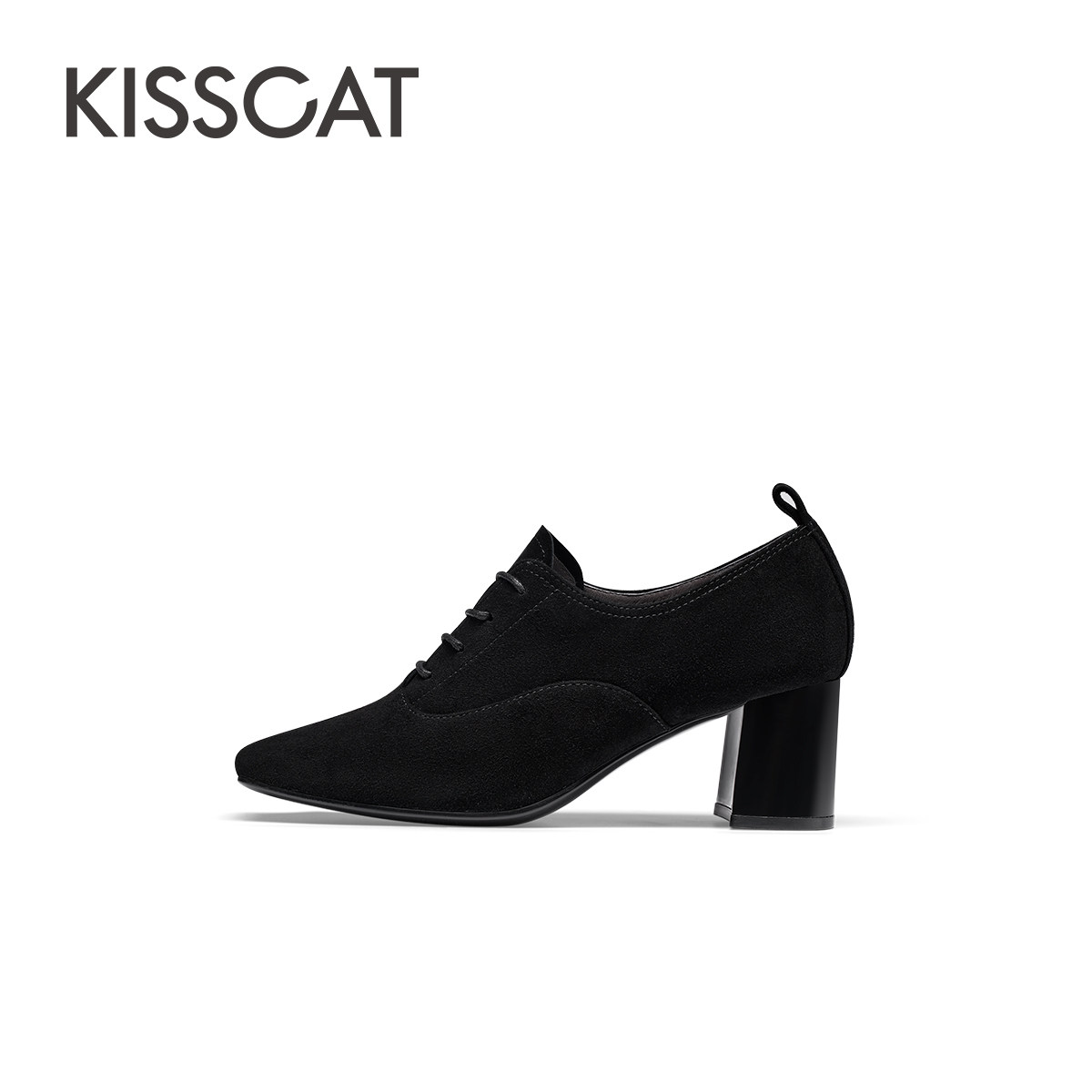 KISSCAT接吻猫新款学院风真皮粗跟鞋时尚绑带时装靴女