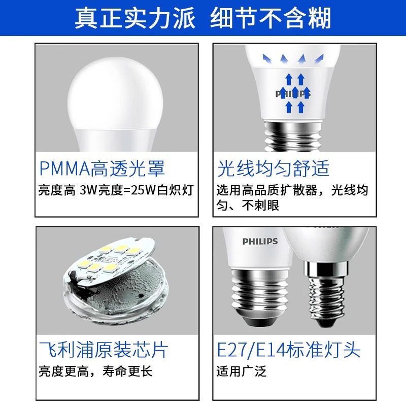 飞利浦led电灯泡E14节能灯E27螺口超亮3瓦暖光9家用白光螺丝口40w