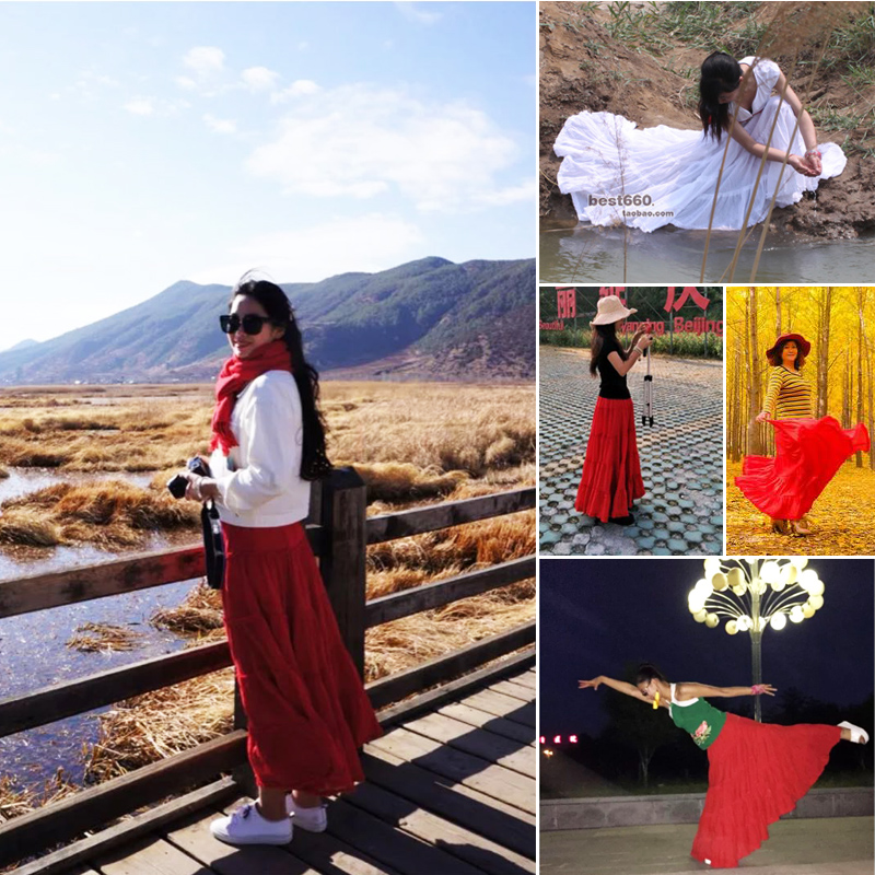 半身长裙夏大摆裙高腰沙滩裙跳舞裙子文艺波西米亚A字半身裙红色