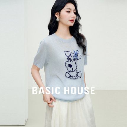 Basic House/百家好小狗提花针织短袖女夏季趣味减龄圆领显瘦上衣
