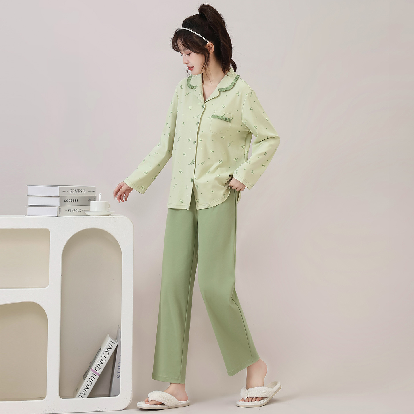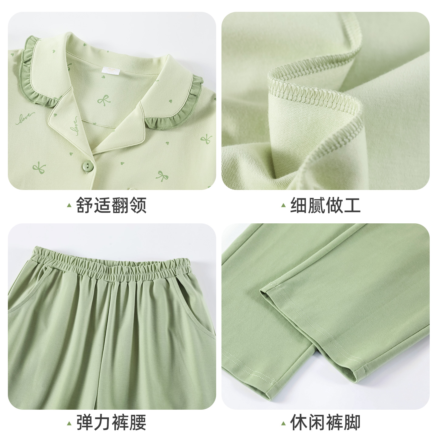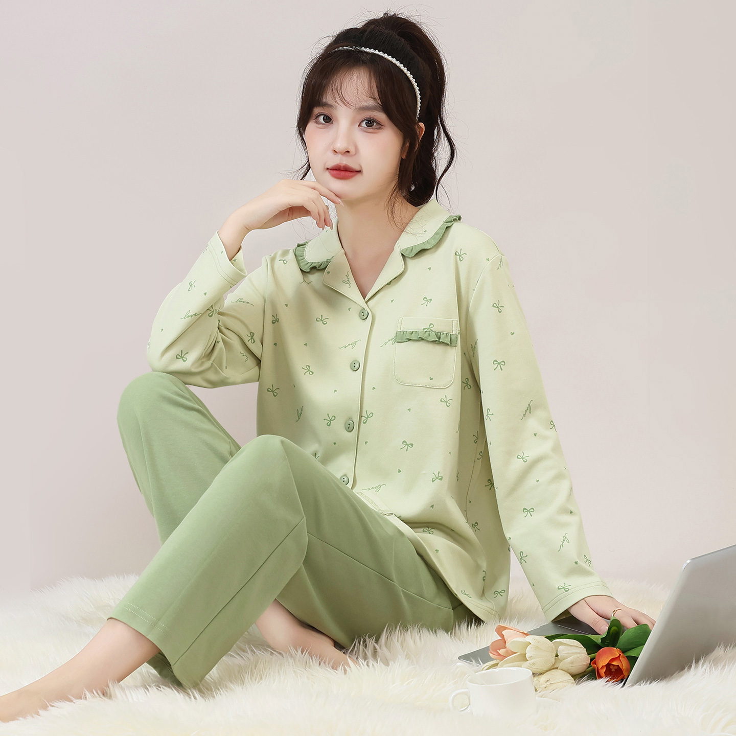 耶蒂纯棉开衫翻领长袖睡衣套装