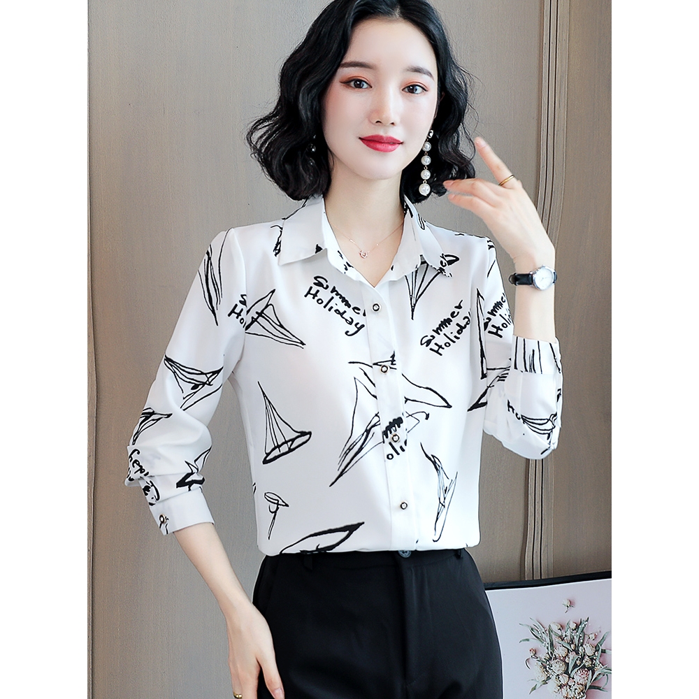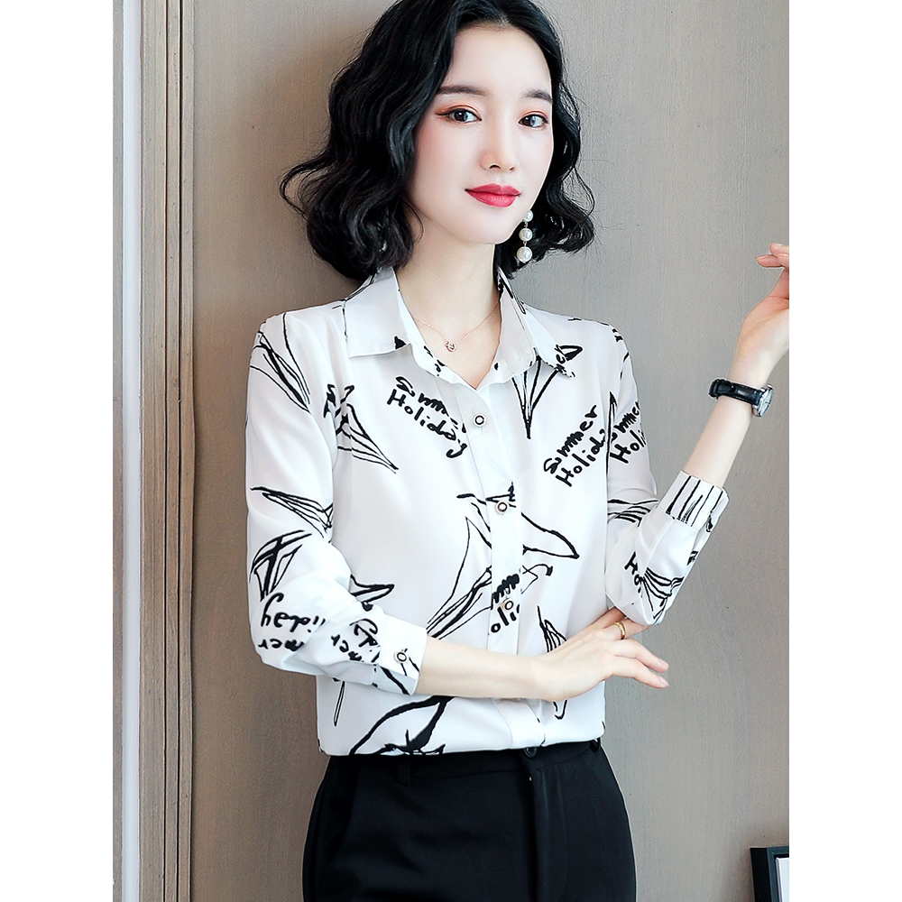 声雨竹印花雪纺衬衫女长袖2025年新款上衣欧货小衫宽松大码妈妈花