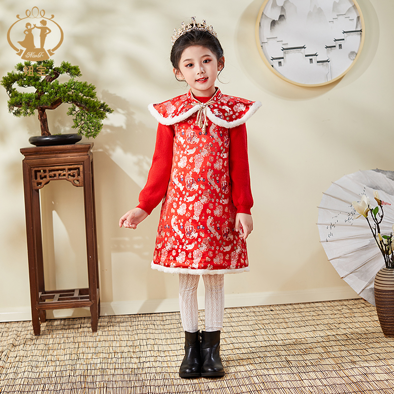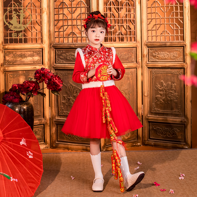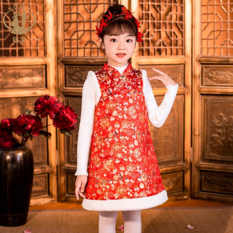 红色拜年服女童中国风新年衣服小女孩马甲背心裙秋冬套装儿童汉服