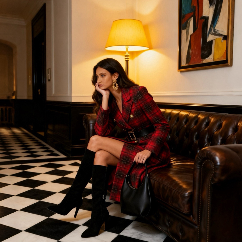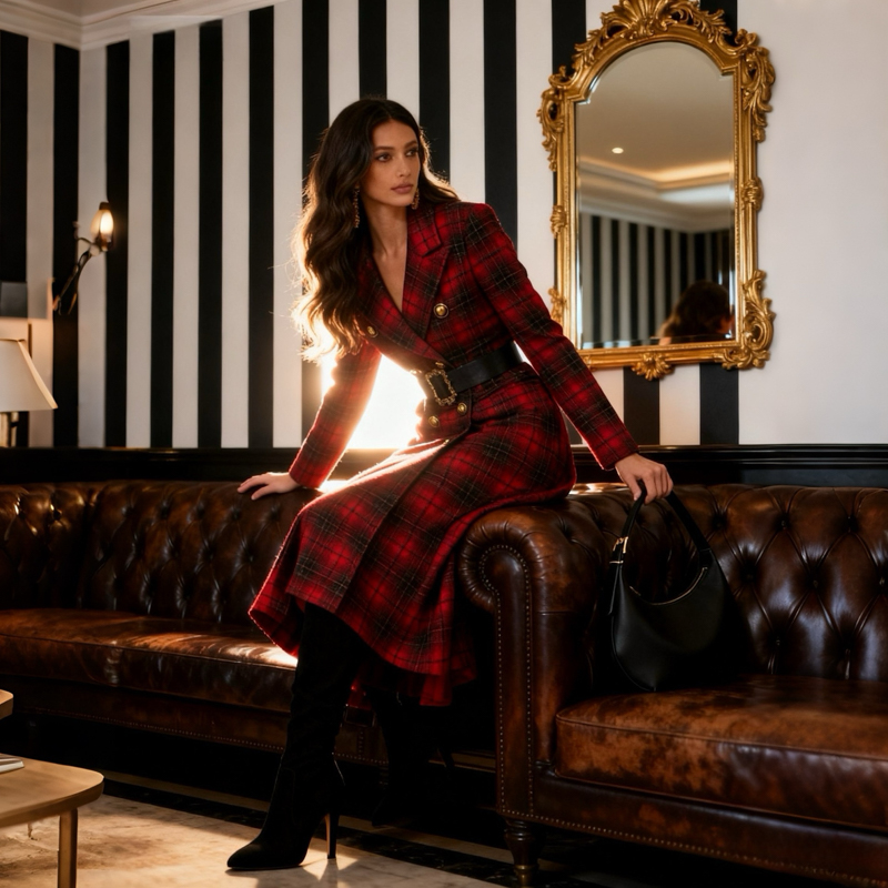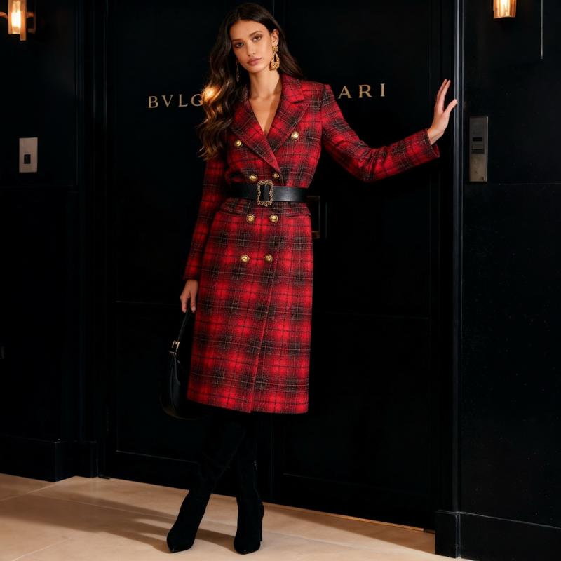 粉红大布娃娃红格子毛呢大衣小个子加厚外套高级感女2025秋冬新款