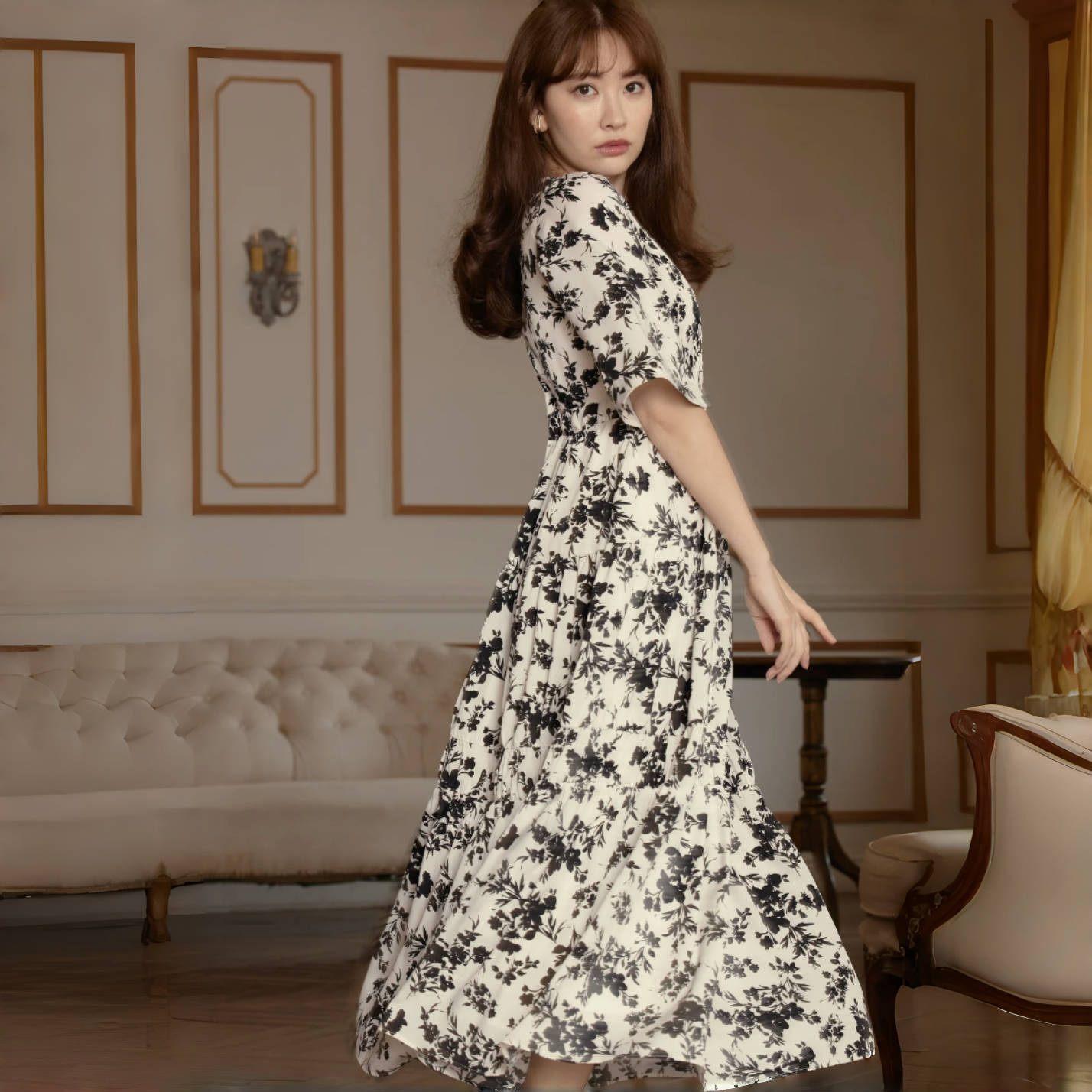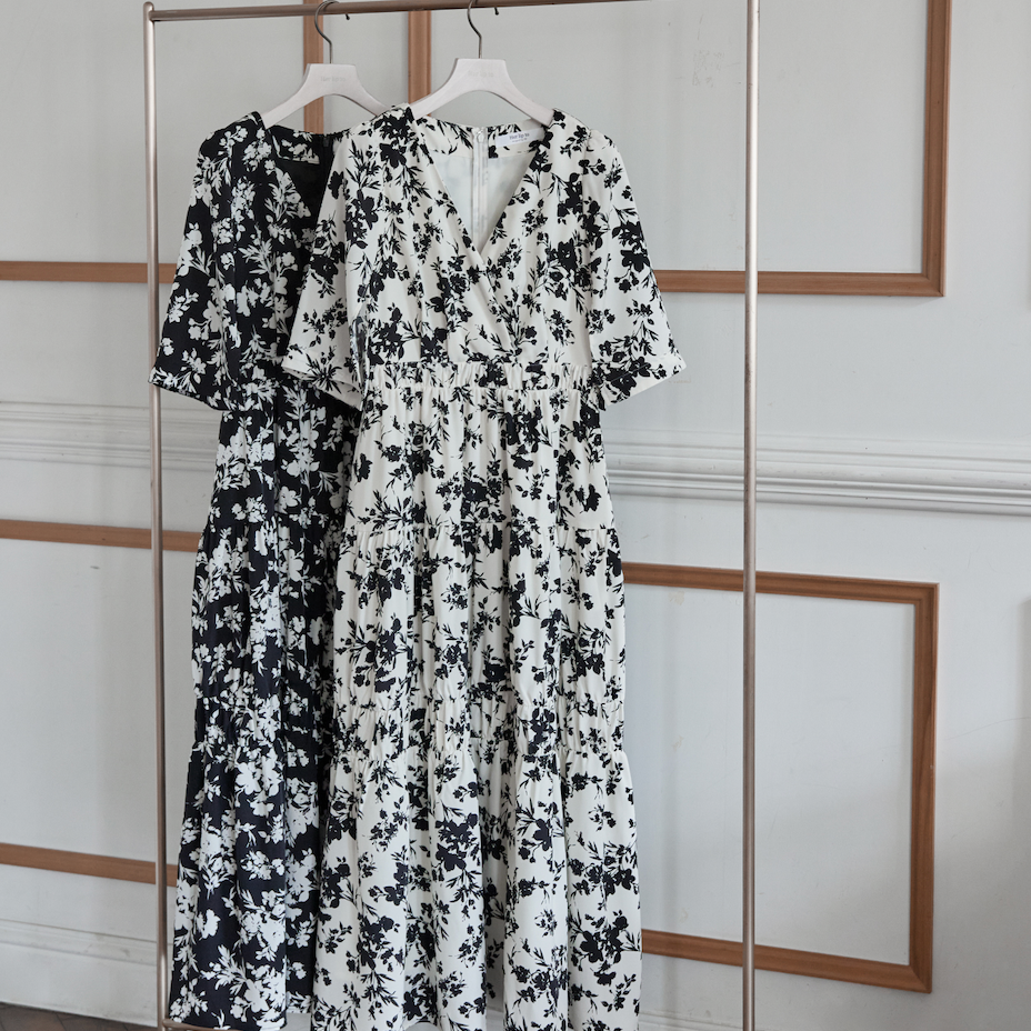 黑白花卉开衩袖连衣裙
