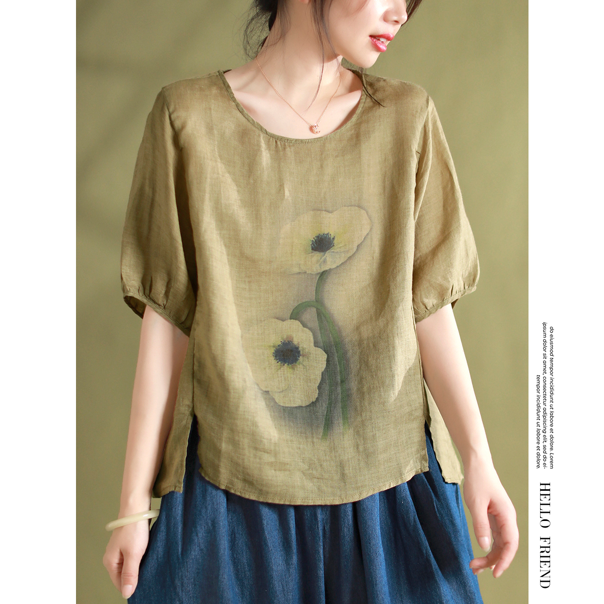 代勒原创文艺复古新款五分袖圆领100细支苎麻T恤衫女印花图案上衣