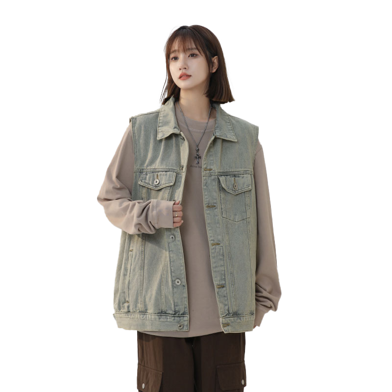 KP真维斯复古水洗牛仔外套女春秋季潮牌工装无袖背心叠穿马甲上衣