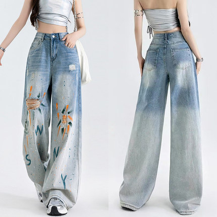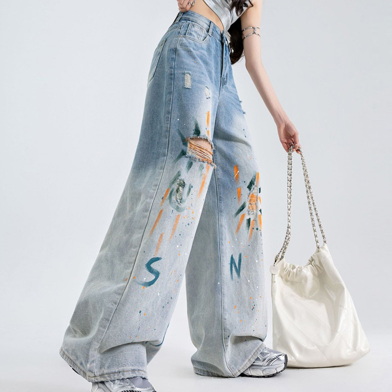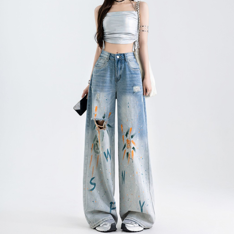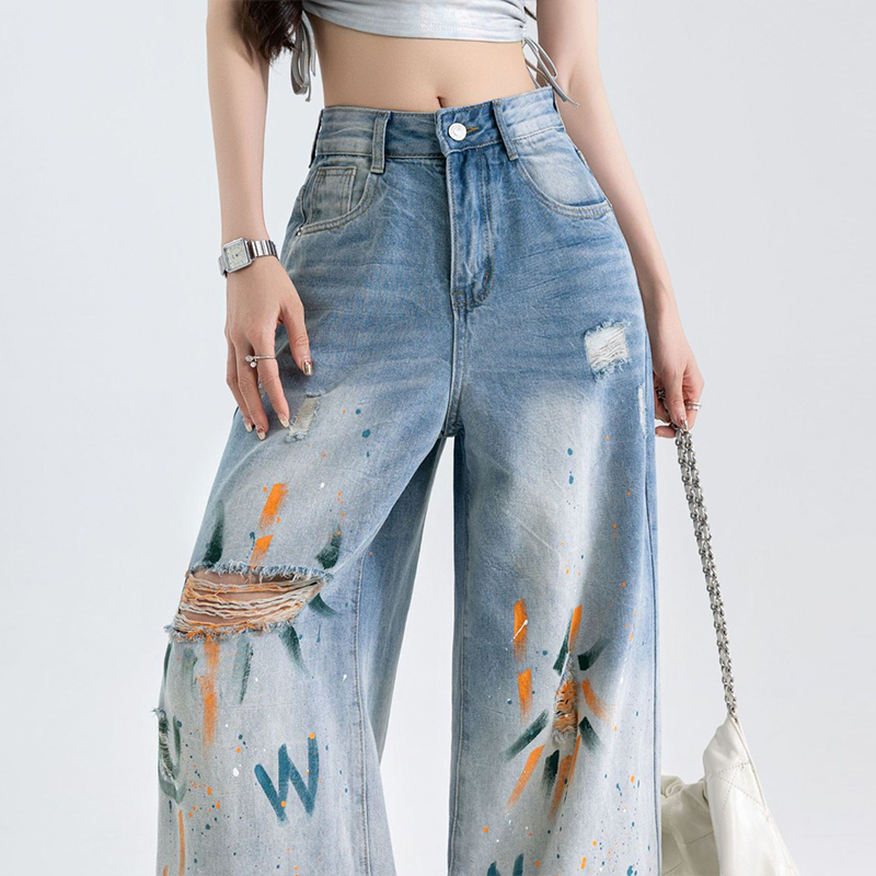 300斤胖mm大码美式个性ins涂鸦牛仔裤女夏季破洞设计显瘦阔腿裤子