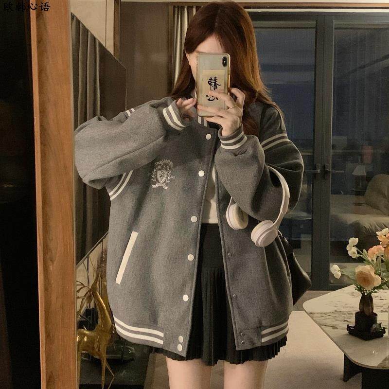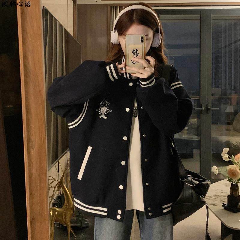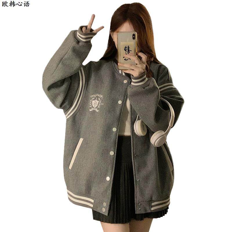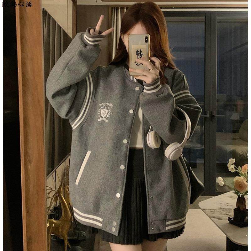 美式复古学院风毛呢棒球服女2025春秋新款宽松情侣款百搭夹克外套