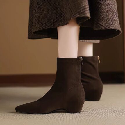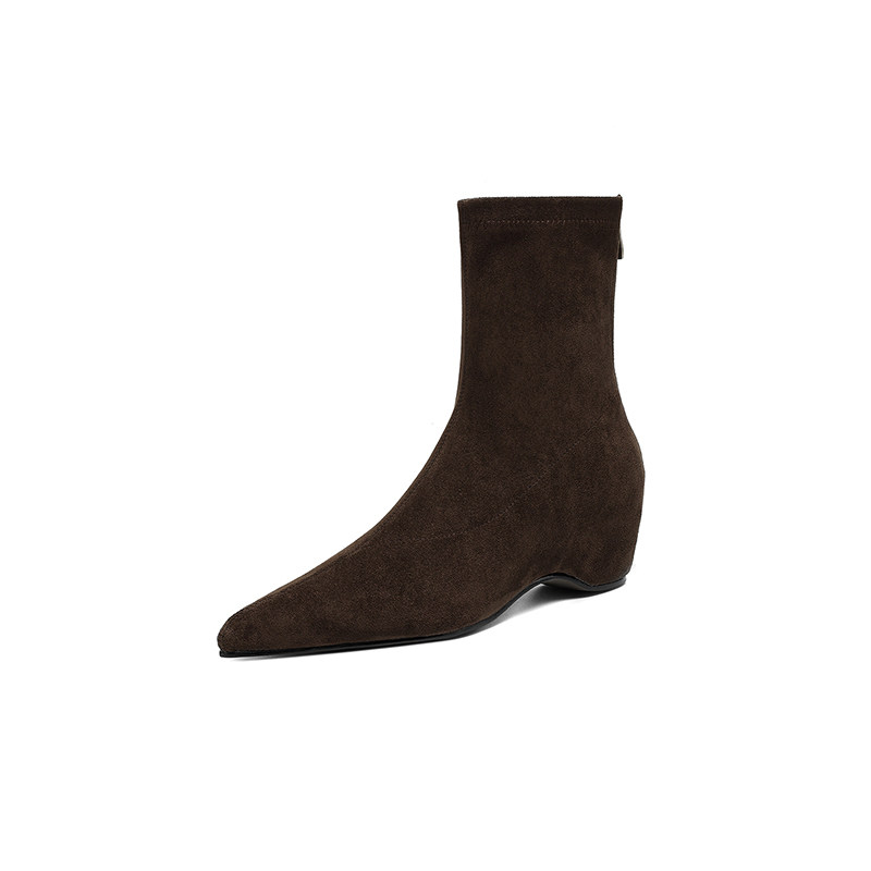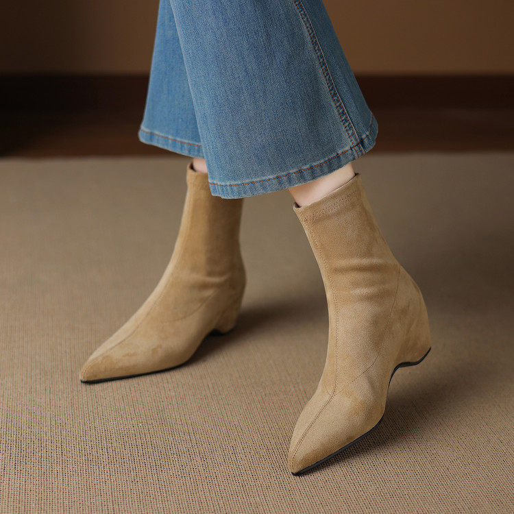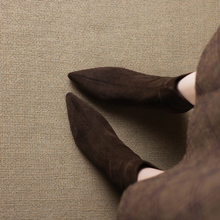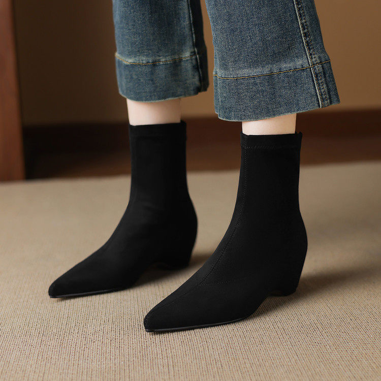 绒面6cm粗跟弹力袜靴女短靴25年秋冬新款法式复古尖头高跟马丁靴