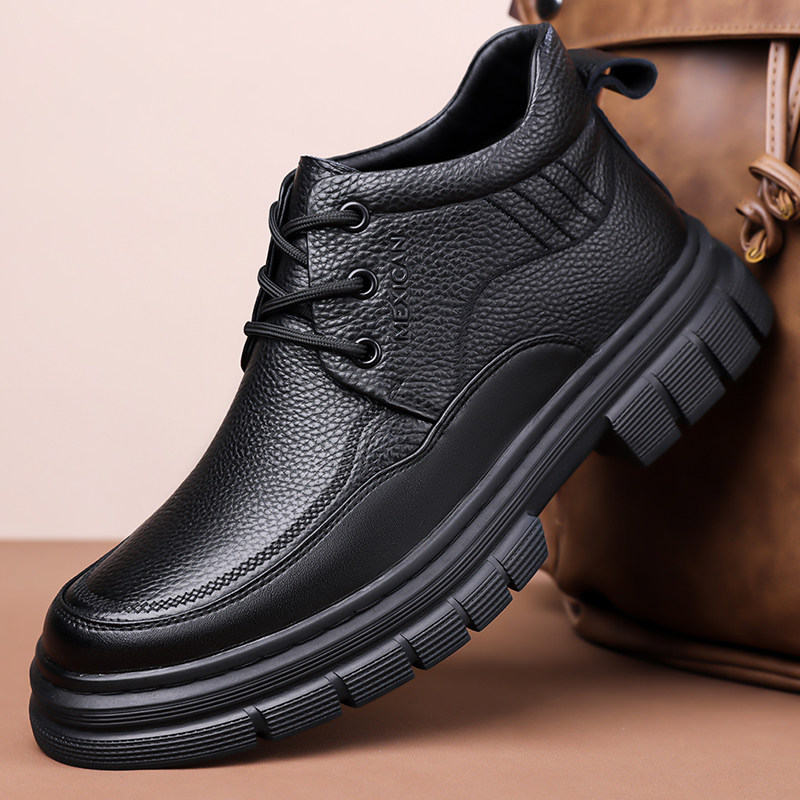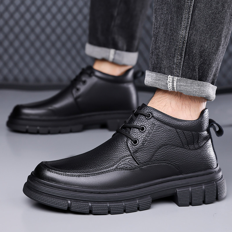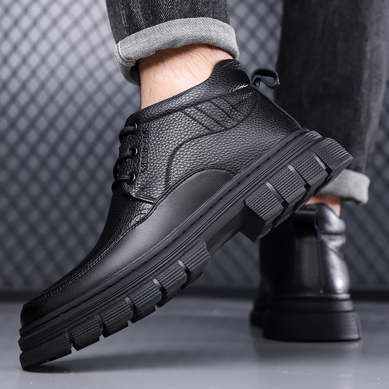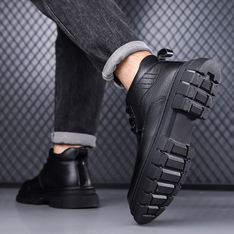 莆田男士真皮黑色套脚马丁靴子中帮短靴厚底舒适保暖加绒皮靴男款