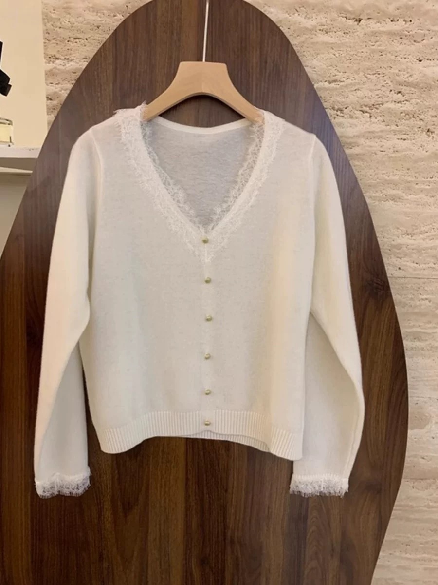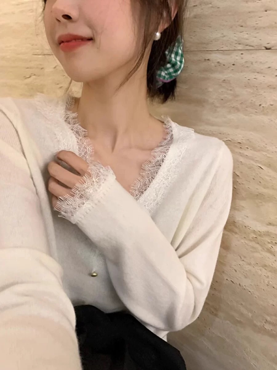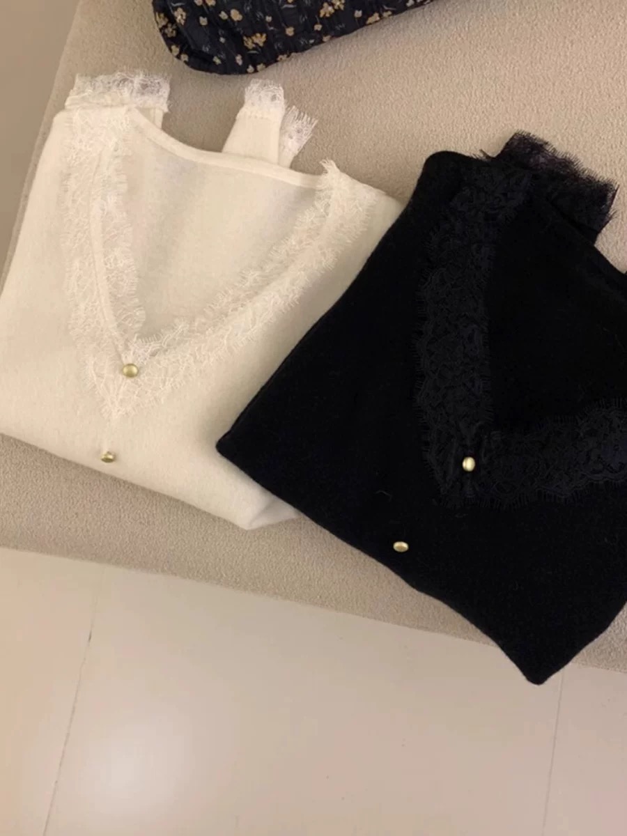 法式蕾丝V领针织打底衫女早春宽松气质黑色性感时尚内搭纯欲上衣