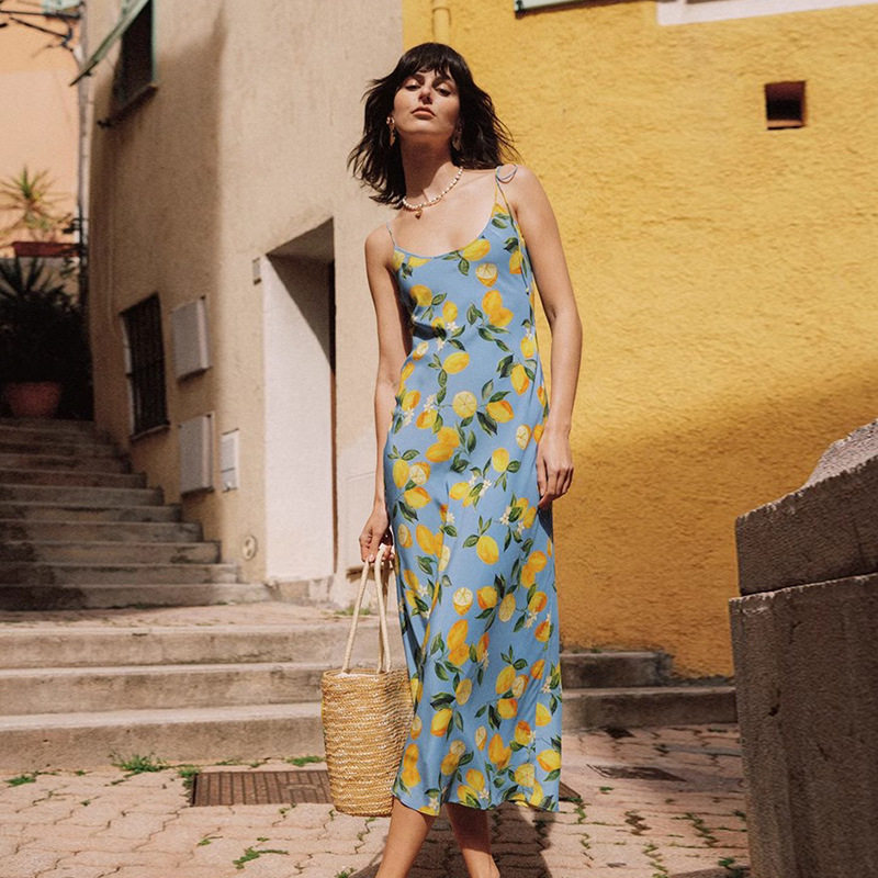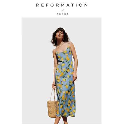 【现货】About Reformation法式真丝柠檬印花绑带长裙斜裁连衣裙