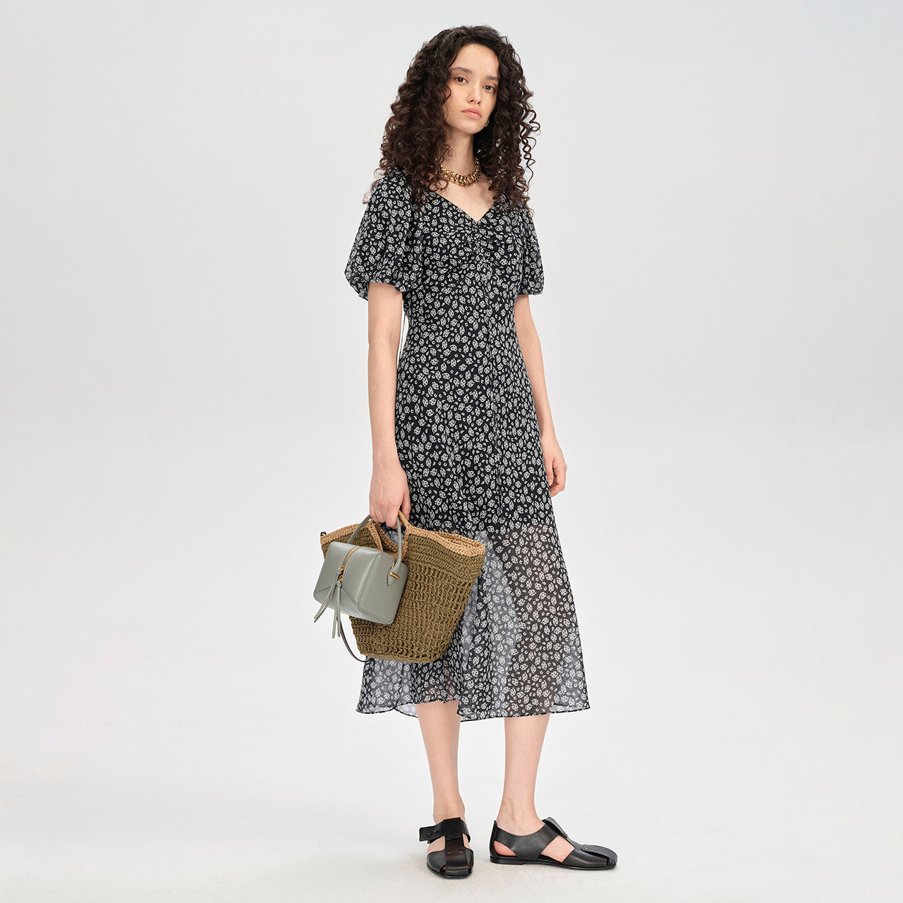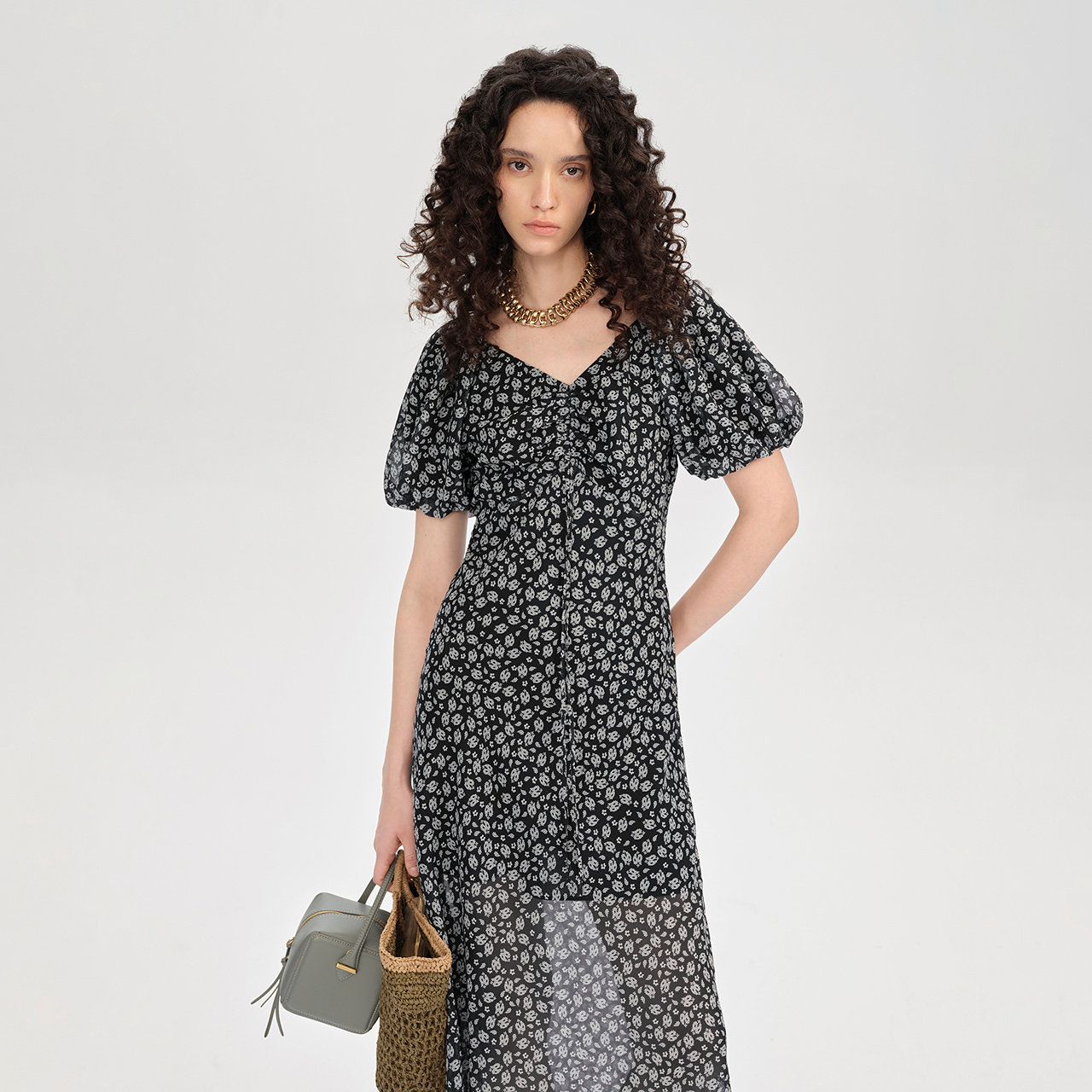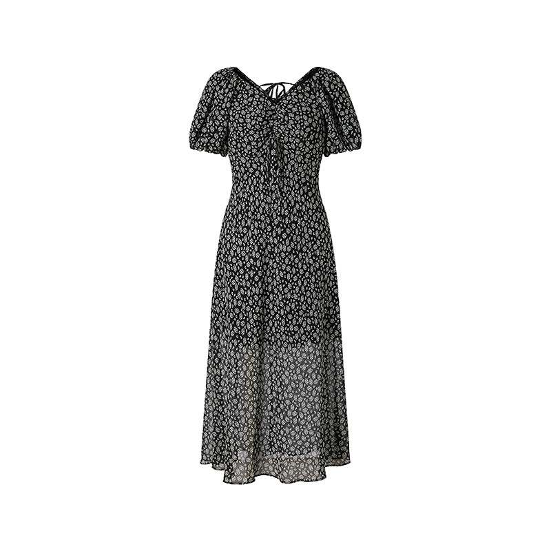 商场同款 摩萨克2025秋新款V领腰果花法式收腰茶歇长款连衣裙女
