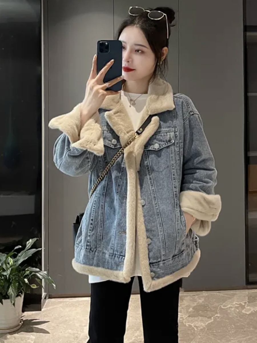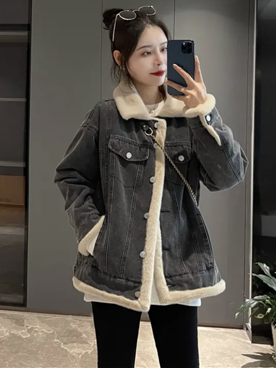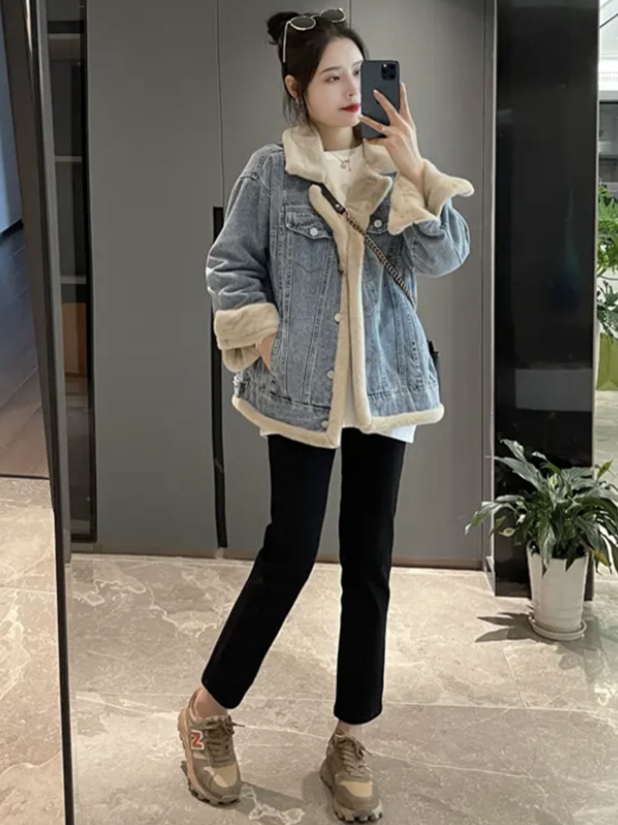 欧货时尚两面穿牛仔外套女秋冬百搭宽松小个子短款加绒保暖棉服潮