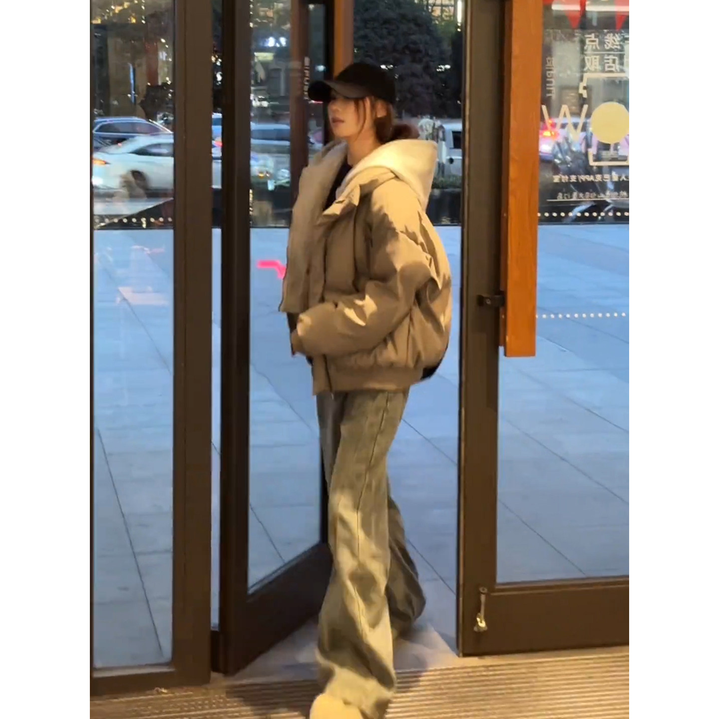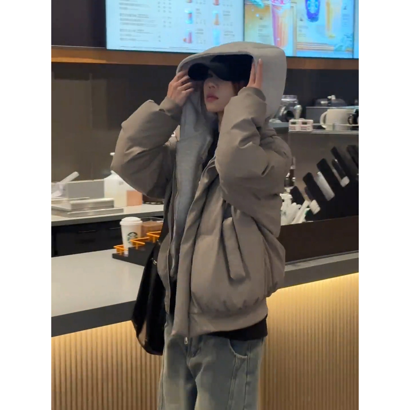 美式假两件连帽pu皮羽绒棉服男女