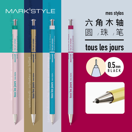 MARK'STYLE六角木杆油性圆珠笔0.5黑色法语装饰印花针管笔尖