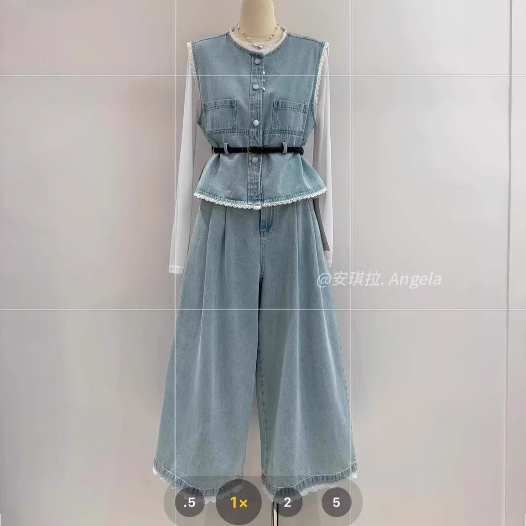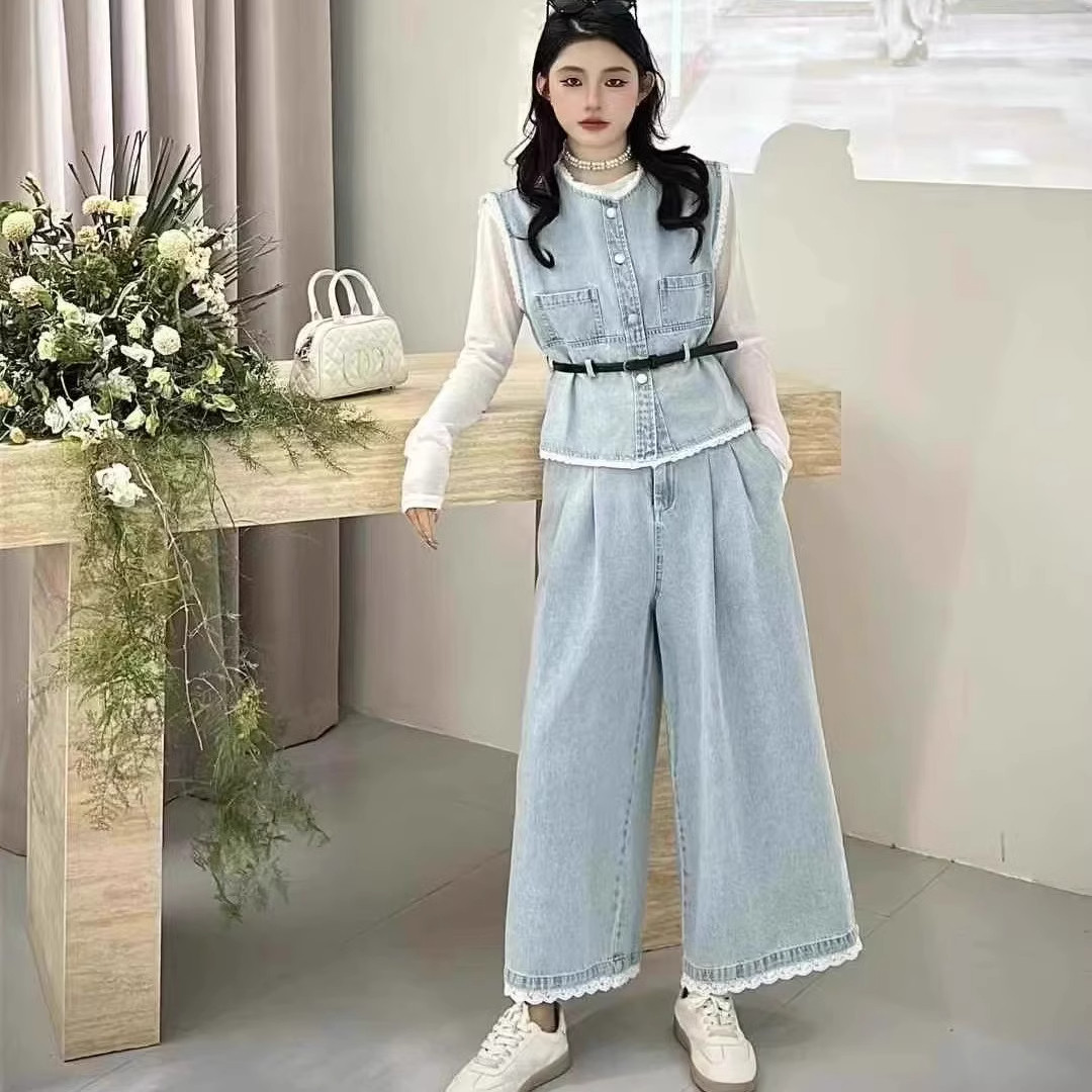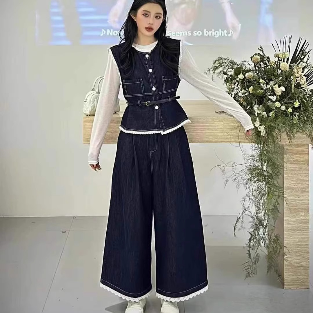 蓝色蕾丝拼接牛仔马甲背心九分阔腿裤时尚套装女春夏小个子三件套