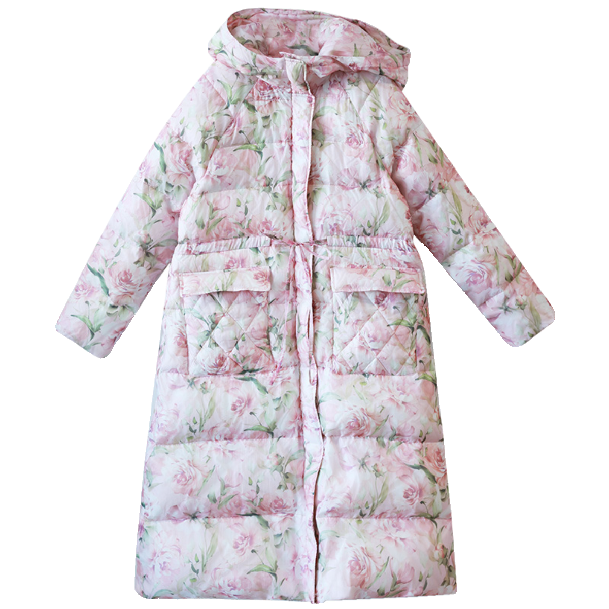 【繁花之境】连帽印花长款羽绒服女2024年冬季加厚白鸭绒系带外套